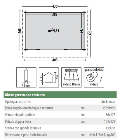 CARATTERISTICHE : Spessore della parete 34 mm          Misure pareti 320x408 cm  Misure interne 383x243 cm             Altezza muro 211 cm   Altezza totale 234cm                        Area 9.31m²                         Misure porte 158x195h cm + vetrata apribile 56x168 cm + vetrata fissa 101x 178 cm colli: 440x118x65 cm ...