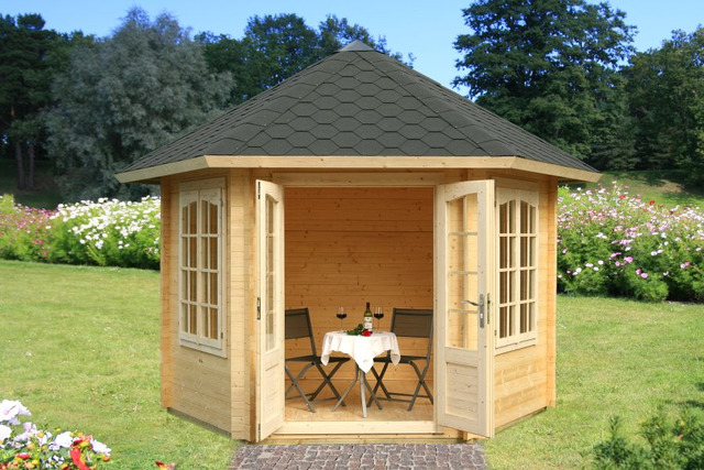 CARATTERISTICHE : spessore della parete 34mm diametro 303 cm Altezza 227 cm Altezza totale 336 cm Area 7,6 m² Volume 19,6 m³ Area Tetto/gradiente 14,8 m² / 32,0° Perline tetto 16mm Misure porte 114x186 cm misura finestra 93x123 cm vetro 4 mm colli: 3,2x1,2x0,8 m peso tot. 755 IMPORTANTE CONSEGNA : il prodotto viene consegnato su bancale ben sigillato con legno e cellofan . Se non si è provvisti di muletto allo scarico è necessario far trovare del personale in modo da aprire il bancale sul camion con l' aiuto dell' autista e scendere i vari componenti a mano (di facile presa per 2 persone) - sulle isole e nei centri più piccoli la consegna potrebbe richiedere qualche giorno in più. UTILE DA SAPEREBUROCRAZIA: L’installazione di una casetta comporta la richiesta alle autorità comunali. Tali richieste possono variare da comune a comune. Deve essere quindi onere e cura dell’acquirente fare le richieste, le autorizzazioni, i permessi e gli assensi delle autorità amministrative necessari secondo le norme vigenti. INSTALLAZIONE: La casetta deve essere installata su una base stabile e indeformabile, in un luogo sopraelevato, che permetta il drenaggio dell’acqua piovana. Al riparo dagli spruzzi dell’eventuale impianto di irrigazione. A dovuta distanza di siepi verdi che impediscano la naturale traspirazione del legno. Normalmente la casetta viene consegnata con un mezzo pesante; se l’imballo è integro la casetta può rimanere all’esterno qualche giorno; (massimo una settimana) a condizione che sia poggiata su una base perfettamente in piano. Prima di iniziare il montaggio, leggere attentamente le istruzioni di montaggio; Per garantire lunga vita alla vostra casetta è consigliabile, prima di iniziare il montaggio, applicare una mano di impregnante (trasparente o molto chiaro) su tutte le tavole e i listelli che la compongono. SICUREZZA: Si raccomanda di eseguire il montaggio adottando sempre i dispositivi di protezione individuali; scarpe, guanti, occhiali protettivi e utilizzare con prudenza gli elettroutensili, scale e tutti gli attrezzi da lavoro necessari. Particolare attenzione è da prestare ai bambini che vanno tenuti lontani dalla zona di lavoro, fino a montaggio completato. MANUTENZIONE: Per proteggere e prolungare la vita della casetta in legno è necessaria una corretta manutenzione. Tutte le casette in legno sono fornite grezze, è necessario proteggerle e decorarle con l’uso di prodotti specifici, come impregnanti e antitarlo. Si raccomanda di effettuare un trattamento con impregnante cerato per esterni, scegliendo la tonalità desiderata. Il trattamento andrà ripetuto ogni qualvolta il colore perda di tonalità o brillantezza a seconda dell’esposizione del legno alle intemperie cercando di utilizzare sempre una stessa colorazione . Controllare periodicamente la stabilità della casetta, il serraggio delle viti e il corretto funzionamento della porta e della finestra. PRECAUZIONI: Chiudere sempre la porta dopo il suo utilizzo. Non inserire mai oggetti incandescenti come barbecue ancora caldi o con braci accese.