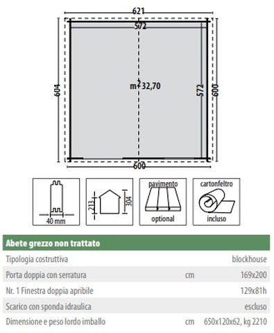 CODICE ARTICOLO: ITALFROM_10875 CARATTERISTICHE : Spessore della parete 40 mm      Misure pareti 600x600 cm  Misure interne 572x572  cm             Altezza muro 213 cm   Altezza totale 304cm                   Area 32,70m²                         Misure porte 169x200 +  finestra doppia apribili 129x81  cm colli: 650x120x62 cm                         peso tot. 2210 kg IMPORTANTE CONSEGNA : il prodotto viene consegnato su bancale ben sigillato con legno e cellofan . Se non si è provvisti di muletto allo scarico è necessario far trovare del personale in modo da aprire il bancale sul camion con l' aiut...