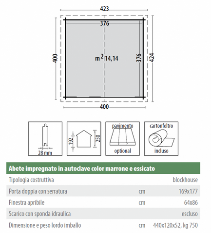 CARATTERISTICHE : Spessore della parete 28mm Misure 400x400 cm Misure interne 376x376 cm Altezza muro 192 cm Altezza totale 250 cm Area 14,14 m² Misure porte 169X177 cm Dimensioni collo 4,40x1,2x0,52 m Peso 750 Kg IMPORTANTE CONSEGNA : il prodotto viene consegnato su bancale ben sigillato con legno e cellofan . Se non si è provvisti di muletto allo scarico è necessario far trovare del personale in modo da aprire il bancale sul camion con l' aiuto dell' autista e scendere i vari componenti a mano (di facile presa per 2 persone) - sulle isole e nei centri più piccoli la consegna potrebbe richiedere qualche giorno in più. PERCHÉ SCEGLIERE QUESTO PRODOTTO:La più classica e diffusa delle casette per giardino, una soluzione che risolve il problema del rimessaggio dei giocattoli dei bambini, le biciclette, il rasaerba e tutto ciò che ingombra il garage o la cantina. UTILE DA SAPEREBUROCRAZIA: L’installazione di una casetta comporta la richiesta alle autorità comunali. Tali richieste possono variare da comune a comune. Deve essere quindi onere e cura dell’acquirente fare le richieste, le autorizzazioni, i permessi e gli assensi delle autorità amministrative necessari secondo le norme vigenti. INSTALLAZIONE: La casetta deve essere installata su una base stabile e indeformabile, in un luogo sopraelevato, che permetta il drenaggio dell’acqua piovana. Al riparo dagli spruzzi dell’eventuale impianto di irrigazione. A dovuta distanza di siepi verdi che impediscano la naturale traspirazione del legno. Normalmente la casetta viene consegnata con un mezzo pesante; se l’imballo è integro la casetta può rimanere all’esterno qualche giorno; (massimo una settimana) a condizione che sia poggiata su una base perfettamente in piano. Prima di iniziare il montaggio, leggere attentamente le istruzioni di montaggio; Per garantire lunga vita alla vostra casetta è consigliabile, prima di iniziare il montaggio, applicare una mano di impregnante (trasparente o molto chiaro) su tutte le tavole e i listelli che la compongono. SICUREZZA: Si raccomanda di eseguire il montaggio adottando sempre i dispositivi di protezione individuali; scarpe, guanti, occhiali protettivi e utilizzare con prudenza gli elettroutensili, scale e tutti gli attrezzi da lavoro necessari. Particolare attenzione è da prestare ai bambini che vanno tenuti lontani dalla zona di lavoro, fino a montaggio completato. PRECAUZIONI: Chiudere sempre la porta dopo il suo utilizzo. Non inserire mai oggetti incandescenti come barbecue ancora caldi o con braci accese. IMPERMEABILIZZAZIONE: La casetta è fornita di cartonfeltro bitumato che se montato correttamente, garantisce una durata di circa due/ tre anni, conviene quindi acquistare e impermeabilizzare la casetta con una copertura di lunga durata come tegole bituminose, onduline, guaina ardesiata ecc. ecc.