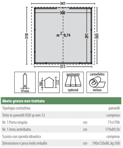 CARATTERISTICHE : Spessore della parete 19mm         Misure travi 310x300 cm Misure pareti 291x300 cm               Altezza muro 180 cm                Altezza totale 222 cm                                  Area 8,74 m²                  &nb...