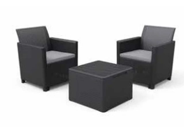 CODICE ARTICOLO: ITALFROM_11052 SALOTTO DA GIARDINO SET ERIALC BALCONY 2 POLTRONE E TAVOLINO CONTENITORE Set da terrazzo per interno/esterno ideale anche per giardini e spazi di intrattenimento. Elementi d'arredo eleganti e sofisticati, con trama piatta in stile rattan resistente e duratura.Dimensioni poltrone 64x64,5x74HDimensioni tavolino 55,5x55,5x42HDimensioni imballo 75x64x60H  • Set dal design lineare ed elegante • Braccioli dotati di finitura che riproduce l'effetto del legno spazzolato • Seduta confortevole dotata di cuscino• Tavolino contenitore con coperchio realizzato con finitura che riproduce l'effetto del legno spazzolato • Realizzato con materiale resistente e durevole, che riproduce la finitura intrecciata del rattan  Il set è disponibile nella colorazione:Grafite/Cuscini Coool Grey