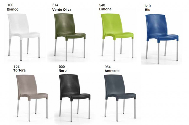 CODICE ARTICOLO: ITALFROM_8115 Set 4 Sedie Modello Jenny in Polipropilene CARATTERISTICHE - Polipropilene in fibra di vetro; - Resistente ai raggi UV e all'umidità; - Resistenza del colore 7/8 (massimo 8); - Gambe in tubo di Alluminio anodizzato ø 25 mm spessore 14 mm; - Gambe fissate alla seduta mediante contrazione plastica- Tappi terminali in polipropilene elasto; - Prodotto in Europa; - Peso 2,71 kg; - Impilabili- 2 anni di garanzia;DIMENSIONI (in cm)COLORIESEMPI