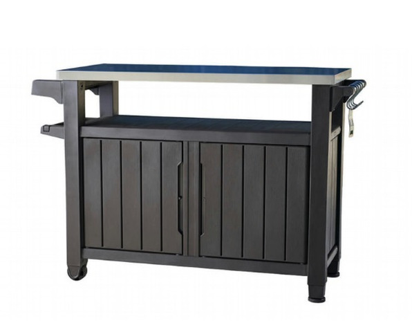 CODICE ARTICOLO: ITALFROM_11317 TAVOLINO PER BBQ IN RESINA  CM. 123,70x54x90hQuesto tavolino è il prodotto ideale per supportarti al meglio nella preparazione del barbecue. Realizzato con resina resistente agli agenti atmosferici e con piano di lavoro in acciaio perfetto per tutte le tue preprazione. Caratterizzato da una finitura effetto legno e da ruote per un facile spostamento . Facile da assemblare e da pulire.TAVOLINO PER BBQ, 2 ANTE, CON FINITURA EFFETTO LEGNO, PIANO DI LAVORO IN ACCIAIO INOX CERTIFICATO PER ALIMENTI CON PORTA ROTOLO, APRIBOTTIGLIE E APPENDI POSATE PER BARBECUE, CON 2 RUOTE - CM. 123,70x54x90h - GRAFITEDimensioni imballo 125 cm x 57 cm x 41 cm