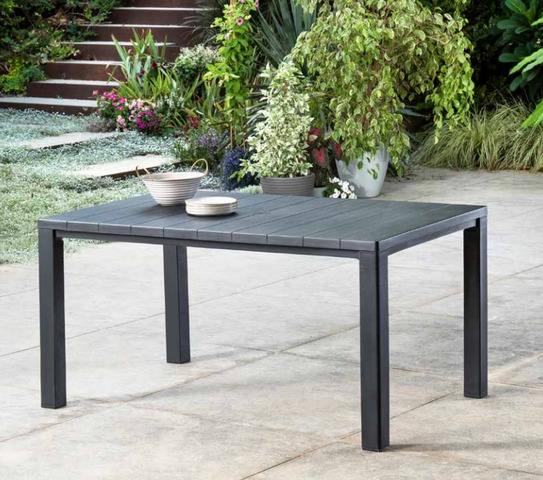 CODICE ARTICOLO: ITALFROM_11095 TAVOLO DA ESTERNO MODELLO EILUJ 147x90x74,5h Tra gli arredi da esterno , quello che non può assolutamente mancare è senza dubbio un tavolo da giardino , protagonista indiscusso dei momenti di convivialità, attorno al quale trascorrere ore piacevoli in famiglia , godersi il tempo libero e scambiare due chiacchiere con gli amici.Dimensioni tavolo 147x90x75HDimensioni imballo 151x93x11H • Tavolo dal design lineare con rinforzi interni in metallo e con predisposizione per ombrellone • Adatto per 6 persone • Realizzato con materiale resistente e durevole, che riproduce nella struttura le sensazioni di una superficie liscia, mentre il piano è realizzato con finitura che riproduce l'effetto del legno spazzolato, Il tavolo è disponibile nella colorazione:GrafiteBianco