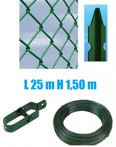 CODICE ARTICOLO: ITALFROM_6701 CONSEGNA 24/48 ORE LAVORATIVE - La composizione va a formare una recinzione di 25 mt lineare con paletti impiantati nel Cemento a 25cm di prof. posizionati circa ogni 2,75 mt(10 paletti), con una matassa da 100mt di fili di tensione, 6 tendifilo e una matassa di 100 mt per legature e accorgimenti vari. L' altezza della recinzione è di h 150 cm. Di seguito i prodotti che compongono la recinzione: (N° 1 PZ) Cod. 2173 ROTOLO 25mt RETE METALLICA ZINCATA PLASTIFICATA 'MAGLIA SCIOLTA'-MAGLIA:mm50X50 -DIAMETRO FILO:mm2,4 - ALTEZZA RETE:150 cm------ rete metallica a semplice torsione, conosciuta sul mercato anche con il nome di 'Maglia sciolta' data la sua realizzazione ad intreccio e non elettrosaldata. Realizzata con maglia mm 50x50 , in filo zincato a caldo e plastificato per estrusione con un forte strato di PVC color verde con diametro esterno del filo 2,4 mm. Caratteristica primaria è l’elevata flessibilità in fase di posa in opera, infatti l’impiego è particolarmente adatto per recintare aree caratterizzate da superfici irregolari. (N° 10 PZ) Cod. 2181 PALETTO RECINZIONI A 'T' IN FERRO PLASTIFICATO VERDE - ALTEZZA 175 cm - PER SOSTEGNO DI RETI METALLICHE--- - Palo in ferro avente sezione a 'T' mm 30x30x3 - plastificato colore verde completo di foratura per passaggio fili di tensione e punta superiore. Adatto per il posizionamento di recinzione sia su terreno che su muretto.Trattamento di base del palo: Sabbiatura, degrassaggio, lavaggio, asciugatura, plastificazione, polimerizzazione a 200°Peso Kg 2,9(N° 1 PZ) Cod. 2195 FILO DI LEGATURA PLASTIFICATO VERDE - DIAMETRO 2mm - PER RECINZIONI IN RETE METALLICA - MATASSA DA 100 mt ----Filo di legatura plastificato diametro 1,10 mm interno e 2,00 mm esterno colore verdefilo estremamente malleabile adatto alle legature della recinzione per una posa in opera perfetta.Il filo di legatura può avere molteplici utilizzi in più campi d'impiego. (N° 1 PZ) Cod. 2198 FILO DI TENSIONE PLASTIFICATO VERDE - DIAMETRO 3,2mm - PER RECINZIONI IN RETE METALLICA - MATASSA DA 100 mt----Filo tensione zincato e plastificato diametro 2,4 mm interno e 3,2 mm esterno, colore verde fornito in matasse. Si tratta di un filo rigido ed acciaioso adatto al tensionamento orizzontale con lo scopo di sorreggere ed irrobustire la recinzione per una posa in opera a regola d'arte.(N° 6 PZ) Cod. 2197 TENDIFILO PLASTIFICATO VERDE PER RECINZIONI IN RETE METALLICA ---- Tenditore/tendifilo a cricchetto per filo da tensione.Si utilizza fissado un capo del filo nel foro esistente e l'altro capo viene inserito nel perno che ruotando mette in trazione il filo senza possibilità di ritorno. Il filo di tensione se non è tirato adeguatamente non ha senso di esistere ed è di fondamentale importanza per una buona riuscita della posa in opera.