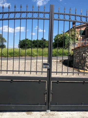 COCONSEGNA 45/50 GIORNI LAVORATIVI - Cancello modulare compreso di pilastri laterali .Potete richiedere preventivi per misure fuori standardMateriale su commissione, di tempi di consegna possono variare di 4/5 ggCARATTERISTICHE: I profili che compongono il cancello sono realizzati mediante profilatura e stampaggio, sono assemblati tra loro solo ed esclusivamente tramite bulloni. Questo particolare sistema brevettato che esclude la saldatura consente di lasciare inalterato le caratteristichedell’acciaio zincato. IL CANCELLO VIENE FORNITO GIA PRE-ASSEMBLATOSPECIFICHE TECNICHE:Pilastri= tub. 120x120x2 mmSerratura= manualeCardine superiore= tassellare/saldare nel pilastroCardine inferiore= saldare o tassellareArresto= a murareSCHEDA TECNICAH. Altezza da pavimento: cm200M. larghezza cancello:445.5cmL. Luce netta :400 cmLarghezza totale intera struttura: 424cm CANCELLO CON BULLONERIA tutta fornita