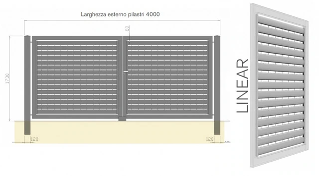 CANCELLO CARRABILE BATTENTE A DUE ANTE 'LINEAR' ZINCATO A CALDO Varie MisureCancello carrabile battente a due ante MADE IN ITALY. Il seguente prodotto appartiene ai cancelli modulari pronti in magazzino. Hanno il grande vantaggio di avere dimensioni e caratteristiche già definite, di agevolare le imprese, che posso predisporre a cantiere ancora aperto, tutte le fondamenta e gli accessori necessari. Non ci sono più inutili attese con possibili fermi cantiere. Il cancello quindi può essere montato con risparmio di costi e tempi senza rinunciare alla qualità che si conserva nel tempo. Tutti i nostri cancelli sono certificati CE. La marcatura CE è infatti una garanzia di accesso sicuro. Secondo quanto previsto dalla Norma europea UNI EN 13241-1 (recepimento della direttiva 89/106/CEE), dal 1° maggio 2005 è obbligatoria la marcatura CE sulle porte e cancelli industriali, commerciali e garage.PUNTI DI FORZA: Rapidità nella consegna Costi ridotti Robustezza nei profili e colonne Dimensioni prestabilite che consentono di fare predisposizioni murarie Stessa dimensione per battente 2 ante e scorrevole Qualità garantita nel tempo perchè zincati a caldo secondo ISO 1461   I cancelli 'LINEAR' sono realizzati con specchiature a doghe brevettate, poste in orizzontale, a passo 100mm. La presenza di tondini verticali a distanza 132 mm, garantisce un' elevata resistenza mantenendo nel contempo un effetto oscurante estremamente leggero ed elegante. Colonne realizzate in tubolare 120X120X3 Struttura ante realizzate in tubolare 80X40X3 Cardini regolabili sicuri: durante l'apertura dell'anta non vi è possibilità di schiacciamento Serratura manuale con chiave e maniglia  Battuta a terra e cariglione manuale  N.B.IMMAGINE A SCOPO ILLUSTRATIVO