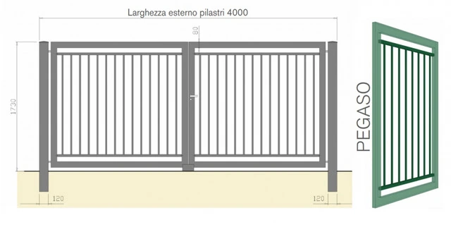 CANCELLO CARRABILE BATTENTE A DUE ANTE 'PEGASO' ZINCATO E VERNICIATO Varie MisureCancello carrabile battente a due ante MADE IN ITALY. Il seguente prodotto appartiene ai cancelli modulari pronti in magazzino. Hanno il grande vantaggio di avere dimensioni e caratteristiche già definite, di agevolare le imprese, che posso predisporre a cantiere ancora aperto, tutte le fondamenta e gli accessori necessari. Non ci sono più inutili attese con possibili fermi cantiere. Il cancello quindi può essere montato con risparmio di costi e tempi senza rinunciare alla qualità che si conserva nel tempo. Tutti i nostri cancelli sono certificati CE. La marcatura CE è infatti una garanzia di accesso sicuro. Secondo quanto previsto dalla Norma europea UNI EN 13241-1 (recepimento della direttiva 89/106/CEE), dal 1° maggio 2005 è obbligatoria la marcatura CE sulle porte e cancelli industriali, commerciali e garage.PUNTI DI FORZA: Rapidità nella consegna Costi ridotti Robustezza nei profili e colonne Dimensioni prestabilite che consentono di fare predisposizioni murarie Stessa dimensione per battente 2 ante e scorrevole Qualità garantita nel tempo perchè zincati a caldo secondo ISO 1461   I cancelli PEGASO sono costruititi impiegando specchiature realizzate con robusti tubi verticali irrigiditi da profilo pressopiegato a 'C' situato alle loro estremità. Colonne realizzate in tubolare 120X120X3 Struttura ante realizzate in tubolare 80X40X3 Cardini regolabili sicuri: durante l'apertura dell'anta non vi è possibilità di schiacciamento Serratura manuale con chiave e maniglia  Battuta a terra e cariglione manuale