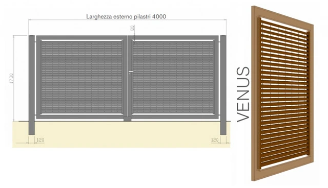 CANCELLO CARRABILE BATTENTE A DUE ANTE 'VENUS' ZINCATO A CALDO Varie MisureCancello carrabile battente a due ante MADE IN ITALY. Il seguente prodotto appartiene ai cancelli modulari pronti in magazzino. Hanno il grande vantaggio di avere dimensioni e caratteristiche già definite, di agevolare le imprese, che posso predisporre a cantiere ancora aperto, tutte le fondamenta e gli accessori necessari. Non ci sono più inutili attese con possibili fermi cantiere. Il cancello quindi può essere montato con risparmio di costi e tempi senza rinunciare alla qualità che si conserva nel tempo. Tutti i nostri cancelli sono certificati CE. La marcatura CE è infatti una garanzia di accesso sicuro. Secondo quanto previsto dalla Norma europea UNI EN 13241-1 (recepimento della direttiva 89/106/CEE), dal 1° maggio 2005 è obbligatoria la marcatura CE sulle porte e cancelli industriali, commerciali e garage.PUNTI DI FORZA: Rapidità nella consegna Costi ridotti Robustezza nei profili e colonne Dimensioni prestabilite che consentono di fare predisposizioni murarie Stessa dimensione per battente 2 ante e scorrevole Qualità garantita nel tempo perchè zincati a caldo secondo ISO 1461   Le specchiature dei cancelli VENUS sono realizzate con profili orizzontali piegati a 'Z'. La proporzione ottimale tra pieni e vuoti garantisce un buon effetto oscurante, salvaguardando la leggerezza della soluzione. Colonne realizzate in tubolare 120X120X3 Struttura ante realizzate in tubolare 80X40X3 Cardini regolabili sicuri: durante l'apertura dell'anta non vi è possibilità di schiacciamento Serratura manuale con chiave e maniglia  Battuta a terra e cariglione manuale