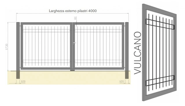 CANCELLO CARRABILE BATTENTE A DUE ANTE 'VULCANO' ZINCATO E VERNICIATO Varie MisureCancello carrabile battente a due ante MADE IN ITALY. Il seguente prodotto appartiene ai cancelli modulari pronti in magazzino. Hanno il grande vantaggio di avere dimensioni e caratteristiche già definite, di agevolare le imprese, che posso predisporre a cantiere ancora aperto, tutte le fondamenta e gli accessori necessari. Non ci sono più inutili attese con possibili fermi cantiere. Il cancello quindi può essere montato con risparmio di costi e tempi senza rinunciare alla qualità che si conserva nel tempo. Tutti i nostri cancelli sono certificati CE. La marcatura CE è infatti una garanzia di accesso sicuro. Secondo quanto previsto dalla Norma europea UNI EN 13241-1 (recepimento della direttiva 89/106/CEE), dal 1° maggio 2005 è obbligatoria la marcatura CE sulle porte e cancelli industriali, commerciali e garage.PUNTI DI FORZA: Rapidità nella consegna Costi ridotti Robustezza nei profili e colonne Dimensioni prestabilite che consentono di fare predisposizioni murarie Stessa dimensione per battente 2 ante e scorrevole Qualità garantita nel tempo perchè zincati a caldo secondo ISO 1461 I cancelli Vulcano sono costruiti impiegando specchiature realizzate con profili orizzontali in patto 30X5 e aste verticali in tondo (pieno) diametro 12 mm. Questa linea è l'emblema del concetto di 'industrial design'. Colonne realizzate in tubolare 120X120X3 Struttura ante realizzate in tubolare 80X40X3 Cardini regolabili sicuri: durante l'apertura dell'anta non vi è possibilità di schiacciamento Serratura manuale con chiave e maniglia Battuta a terra e cariglione manuale N.B.IMMAGINE A SCOPO ILLUSTRATIVO
