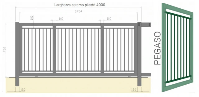 CANCELLO CARRAIO SCORREVOLE 'PEGASO' ZINCATO A CALDO Varie MisureCancello carraio scorrevole MADE IN ITALY. Il seguente prodotto appartiene ai cancelli modulari pronti in magazzino. Hanno il grande vantaggio di avere dimensioni e caratteristiche già definite, di agevolare le imprese, che posso predisporre a cantiere ancora aperto, tutte le fondamenta e gli accessori necessari. Non ci sono più inutili attese con possibili fermi cantiere. Il cancello quindi può essere montato con risparmio di costi e tempi senza rinunciare alla qualità che si conserva nel tempo.PUNTI DI FORZA: Rapidità nella consegna Costi ridotti Robustezza nei profili e colonne Dimensioni prestabilite che consentono di fare predisposizioni murarie Stessa dimensione per battente 2 ante e scorrevole Qualità garantita nel tempo perchè zincati a caldo secondo ISO 1461   I cancelli PEGASO sono costruititi impiegando specchiature realizzate con robusti tubi verticali irrigiditi da profilo pressopiegato a 'C' situato alle loro estremità. Colonna di scorrimento e colonna di battuta realizzate a cavallotto, in tubolare 120X60X3, al fine di escludere il pericolo di caduta dell'anta Struttura anta realizzata in tubolare 100X50X3 Battuta fine corsa da saldare alla guida e vite di sicurezza applicata sull'anta Guida a terra di lunghezza adeguata inclusa Ruote tropicalizzate interne alla struttura dell'anta Serratura a gancio interna al tubolare dell'anta