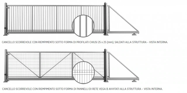 CANCELLO SCORREVOLE AUTOPORTANTE FINO A 7 m O CONVERGENTE FINO A 12 m (2 CANCELLI DA 6 m) Supplemento Trasporto per Sicilia, Sardegna e isole minori € 500 + iva*scegli la tua misura dal menù a tendina sopra.Per MISURE PERSONALIZZATE contattateci via e-mail a ************************* oppure telefonicamente ai numeri (+39) *************, (+39) ************* o (+39) *************N.B. le misure si intendono in mm e sono l'altezza dell'anta e la Lunghezza tra i pali (luce netta). I cancelli leggeri scorrevoli PI 95 rappresentano la chiusura ideale per tutte le aree di attività, sono utilizzati per la chiusura di edifici industriali, aeroporti,  porti, parcheggi sorvegliati, ma anche da scuole, asili, supermarket, ecc. I cancelli scorrevoli PI 95 sono autoportanti e per l'installazione non hanno bisogno dello scavo, delle fondazioni in calcestruzzo sotto il cancello e del binario di scorrimento. Rappresentano la soluzione migliore nel caso in cui il passo carrabile sia ridotto o il terreno irregolare e l'installazione di cancelli a due battenti non sia possibile. IMPORTANTE ALLA CONSEGNA : il prodotto viene consegnato con camion autoarticolato ( bilico) di circa 14mt   . Se non si è provvisti di muletto/i allo scarico è necessario far trovare del personale adeguato in modo da  scendere il materiale a mano dal camion - sulle isole e nei centri più piccoli la consegna potrebbe richiedere qualche giorno in più. Su richiesta a pagamento possiamo offrire servizio gru.ATTENZIONE!!! Per Consegna in Sicilia, Sardegna ed isole minori contattare il responsabile commerciale perchè i costi potrebbero variare!!! DIMENSIONI DISPONIBILIAMPIO CAMPO DIMENSIONALE:• larghezza in un campo da 3500-7000 [mm]• altezza da un campo di 1000–2200 [mm]APPLICAZIONEIl cancello autoportante PI 95 è progettato per la chiusura di ingressi con luce di passaggio fino a 7 metri, e nel caso di utilizzo di cancelli convergenti (2×6 m) fino a 12 metri.Caratteristiche:• anta in costruzione chiusa con profilati 60 x 60 mm;• guida di scorrimento 95 x 85 x 3 mm;• riempimento dell'anta:   profilato chiuso 25x25 mm. Luce libera tra i profilati ~ 110 mm,   a richiesta con pannelli medium;• doppia colonna di guida;• colonna d’arrivo dotata di presa (120x120);• supporto posteriore di stabilizzazione del cancello dopo la sua apertura (a seconda della larghezza del cancello (So > 6000mm e/o H>2000mm),• profili di collegamento 60 x 40 mm;• serratura tipo LOCINOX;• in caso di cancello automatico con motorizzazione (senza serratura), motore collocato nella colonna o esterno;FUNZIONALITÁ CANCELLO MANUALEFUNZIONALITÁ CANCELLO AUTOMATICO PER MAGGIORI DETTAGLI ED ACQUISTO DELL'AUTOMAZIONE DEI CANCELLI SCORREVOLI CLICCA QUISTRUTTURA AUTOPORTANTE ROBUSTAGUIDA DI SCORRIMENTOIl cancello PI 95 è una struttura autoportante, l’anta è fissata su una guida di scorrimento di sezione 95x85x3 [mm] che scorre su due carrelli.DIMENSIONI D'ORDINE E STRUTTURA E DIMENSIONI DI INCASSODIMENSIONI DI MONTAGGIO DEL CANCELLO SCORREVOLECancello destro, vista interna (la direzione d'ordine del cancello è la dimensione di apertura del cancello vista dal lato della residenza).ESEMPI DI RIEMPIMENTI DI CANCELLI SCORREVOLI AUTOPORTANTI *SU RICHIESTA E' POSSIBILE AVERE ALTRE TIPOLOGIE DI RIEMPIMENTI*SICUREZZA ANTIRUGGINEDURABILITÀ PER ANNITutti gli elementi delle recinzioni residenziali sono sottoposti ai migliori metodi della protezione anti ruggine in forma di zincatura e verniciatura a polvere. Il rivestimento in zincatura ottenuto nel processo di immersione della costruzione prelavata chimicamente nel bagno di zinco liquido, protegge gli elementi delle recinzioni dalla ruggine per decine di anni.SISTEMA DUPLEX - PROTEZIONE DUPLICEIl sistema DUPLEX consente di prolungare notevolmente il periodo di sfruttamento delle recinzioni grazie alla duplice azione del rivestimento in zincatura e laccatura. L'uso della gamma RAL permette di scegliere un colore opportuno della pellicola di sicurezza in poliestere.VERIFICATE IN OGNI CONDIZIONEIl Processo di zincatura è conforme alla norma europea PN-EN ISO 1461 che garantisce la qualità dei prodotti zincati. Il rivestimento di zinco è resistente alle alte e basse temperature.COLORICOLORI DISPONIBILINello standard i cancelli sono disponibili in zincatura a caldo o zincatura a caldo rivestita in poliestere.I cancelli industriali sono disponibili anche in altri colori della tavolozza RAL. La base mobile è disponibile in versione di acciaio grezzo o zincata a caldo.