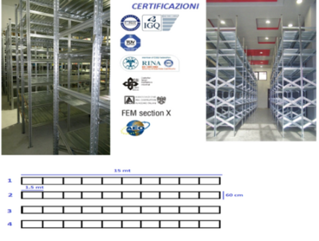 CODICE ARTICOLO: ITALFROM_2034 MERCE DISPONIBILE , CONSEGNA IN 3 GG CON CORRIERE ESPRESSO , TRASPORTO ASSICURATO Descrizione Materiale in vendita - 44 spalle complete Di distanziali Diagonali e base Altezza 3,00 mt Profondità 60cm Portata 1500KG - 200 Ripiani completi di correnti Lunghezza 150 cm Profondità 60 cm portata 145 kg a ripiano . Il tutto assemblato forma 4 scaffalature lunghezza 15 metri , altezza 3,00 mt , profondità 60 cm , formata ognuna da 10 elementi da 150 cm con 5 ripiani ognuno . ------------------------------------------------------------------------------------------ N.B. HAI BISOGNO DI DIVIDERE LA SCAFFALATURA ? PER DIVIDERE LA SCAFFALATURA IN PIU' SEZIONI O PROLUNGARE LA STRUTTURA O SEMPLICEMENTE ARRICCHIRLA DI PIU' RIPIANI PUOI ACQUISTARE ALTRE SPALLE O RIPIANI (VEDI ARTICOLI CORRELATI IN FONDO PAGINA) OPPURE CONTATTACI TELEFONICAMENTE ( TEL ***********) PER AGGIUNGERE GLI ARTICOLI O RICHIEDERE UN PREVENTIVO SU MISURA PER LE TUE ESIGENZE ------------------------------------------------------------------------------------------ I VANTAGGI DEL PRODOTTO :- PRODOTTO VERSATILE , UTILE PER SVARIATE ESIGENZE - PRODOTTO IN ACCIAIO ZINCATO ( NON ARRUGGINISCE ) - SICUREZZA MADE IN ITALY (MERCE CERTIFICATA)- VELOCITA E SEMPLICITA' DI MONTAGGIO (COMPLETAMENTE AD INCASTRO ) - SCAFFALATURA COMPONIBILE CON POSSIBILITA' DI ACQUISTARE ALTRE SPALLE O RIPIANI PER DIVIDERLA IN PIU' CAMPATE , O PROLUNGARE LE STRUTTURE- MERCE ACCOMPAGANTA DA ISTRUZIONI - RISOLVE LA VERE ESIGENZE DEL MERCATO : STABILITA' COSTO E PORTATA - DISPONIBILE PRESSO LA NOSTRA AZIENDA SEMPRE IN QUANTITA' ELEVATE IN PRONTA CONSEGNA - CONSEGNA IN 24 / 48 ORE DESCRIZIONE PRODOTTO (MADE IN ITALY) E' il prodotto piú versatile per soddisfare le piú svariate esigenze dello stoccaggio manuale. Nella sua configurazione standard con ripiani é particolarmente adatto per l'archivio , per l'uso domestico ,per il magazzino , ricambistica settore auto, rivendite e magazzini per il settore elettrico o idraulico e altri. Grazie al suo design accattivante ed 'hi tech', coperto da brevetto internazionale,questo scaffale si presta inoltre all'utilizzo in ambienti aperti al pubblico con funzione di arredo di negozi e uffici. Le strutture super 15 , 20 , 36 , completamente ad incastro, compatibili tra loro ed ampliabili a piacere sono state progettate e realizzate con lo scopo di risolvere le problematiche dello stoccaggio manuale dando al contempo la possibilitá di realizzare strutture a passerella fino a 5 metri di altezza. Le forme e le caratteristiche dei vari componenti sono frutto di prove e di verifiche tecniche collaudate nell'arco di anni di esperienza nella lavorazione dei metalli. La disposizione delle nervature di rinforzo, ad esempio, consente notevoli prestazioni e portate con il massimo sfruttamento della materia prima. Tali esperienze ci hanno consentito di realizzare un prodotto altamente tecnico,che risolve le vere esigenze del mercato : VELOCITA' DI MONTAGGIO, STABILITA' , COSTO E PORTATA. L'utilizzo di lamiera zincata garantisce l'inalterabilitá nel tempo del prodotto. I componenti strutturali sono realizzati in acciaio alto resistenziale certificato 3.1B secondo le norme EN10204. La sicurezza e la qualità del prodotto(INTERAMENTE MADE IN ITALY) sono garantite da certificazioni internazionali tra cui il TUV-GS di Monaco di Baviera , uno tra i piu' importanti organi di controllo per '' la sicurezza e la qualità del prodotto'' in Europa , l' O-NORM austriaca , l' I.SP.E.S.L. di Roma , l' ACAI/CISI (ASSOCIAZIONE COSTRUTTORI ACCIAIO ITALIANI- SEZIONE COSTRUTTORI ITALIANI DI SCAFFALATURE INDUSTRIALI) e altri. Il sistema di qualità aziendale ISO9001 , nonche' il sistema ambientale ISO 14001 , sono certificati dall'ente RINAVIDEO MONTAGGIO