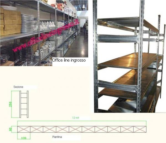 Scaffalatura industriale a ripiani lunghezza 12 metri , altezza 2,50 mt, profondità 60 cm con 5 rip