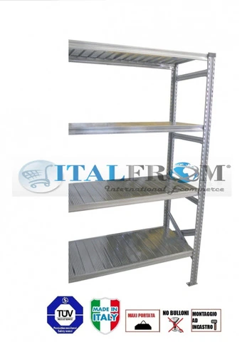 CODICE ARTICOLO: ITALFROM_4185 MODULO CONTINUATIVOscaffalatura industriale zincata componibile Lunghezza 120 cm , H 200 cm , prof. 80 cm , con 4 ripiani Composta da :- 1 spalla H 200 x 80 cm , completa di distanziali , diagonali e basi metalliche , portata cad. 1500 Kg- 4 ripiani L 120 x 80 cm , completi di sistema antisgancio , PORTATA OGNUNO 180 Kg I vantaggi del prodotto MADE IN ITALY :- Velocità e semplicità di assemblaggio (COMPLETAMENTE AD INCASTRO)- Prodotto versatile , utile per svariate esigenze , principalmente per il magazzino e l'industria- Prodotto in ACCIAIO ZINCATO alto resistenziale certificato 3.1B secondo le norme EN10204- Merce fornita con manuale di montaggio- Risolve la vere esigenze del mercato : STABILITA' COSTO E PORTATA- DISPONIBILE PRESSO LA NOSTRA AZIENDA SEMPRE IN QUANTITA' ELEVATE e IN PRONTA CONSEGNA- CONSEGNA IN 24 / 48 ORE DESCRIZIONE GENERALE DEL PRODOTTO E CERTIFICAZIONIE' il prodotto piú versatile per soddisfare le piú svariate esigenze dello stoccaggio manuale. Nella sua configurazione standard con ripiani é particolarmente adatto per l'archivio , per l'uso domestico ,per il magazzino , ricambistica settore auto, rivendite e magazzini per il settore elettrico o idraulico e altri. Grazie al suo design accattivante ed 'hi tech', coperto da brevetto internazionale,questo scaffale si presta inoltre all'utilizzo in ambienti aperti al pubblico con funzione di arredo di negozi e uffici. Le strutture super 15 , 20 , 36 , completamente ad incastro, compatibili tra loro ed ampliabili a piacere sono state progettate e realizzate con lo scopo di risolvere le problematiche dello stoccaggio manuale dando al contempo la possibilitá di realizzare strutture a passerella fino a 5 metri di altezza. Le forme e le caratteristiche dei vari componenti sono frutto di prove e di verifiche tecniche collaudate nell'arco di anni di esperienza nella lavorazione dei metalli. La disposizione delle nervature di rinforzo, ad esempio, consente notevoli prestazioni e portate con il massimo sfruttamento della materia prima. Tali esperienze ci hanno consentito di realizzare un prodotto altamente tecnico,che risolve le vere esigenze del mercato : VELOCITA' DI MONTAGGIO, STABILITA' , COSTO E PORTATA. L'utilizzo di lamiera zincata garantisce l'inalterabilitá nel tempo del prodotto. I componenti strutturali sono realizzati in acciaio alto resistenziale certificato 3.1B secondo le norme EN10204. La sicurezza e la qualità del prodotto(INTERAMENTE MADE IN ITALY) sono garantite da certificazioni internazionali tra cui il TUV-GS di Monaco di Baviera , uno tra i piu' importanti organi di controllo per '' la sicurezza e la qualità del prodotto'' in Europa , l' O-NORM austriaca , l' I.SP.E.S.L. di Roma , l' ACAI/CISI (ASSOCIAZIONE COSTRUTTORI ACCIAIO ITALIANI- SEZIONE COSTRUTTORI ITALIANI DI SCAFFALATURE INDUSTRIALI) e altri. Il sistema di qualità aziendale ISO9001 , nonche' il sistema ambientale ISO 14001 , sono certificati dall'ente RINA.VIDEO MONTAGGIO