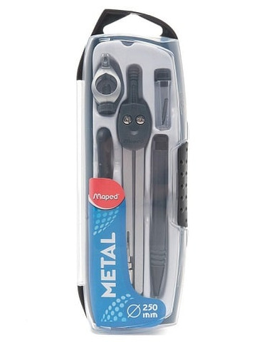 Astuccio 5 pezzi: 1Compasso mina - 1Astuccio mine-1adattatore universale Perfetta rigidità Aste in acciaio snodabili - Max circonferenza 250mm -Temperamine - Lunghezza compasso 130mm - Confezione 20 pz