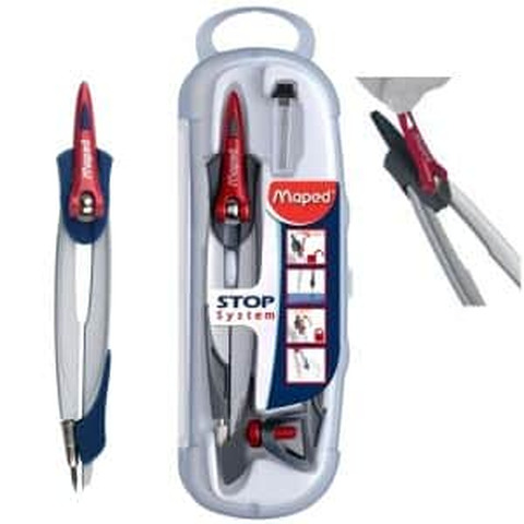 Astuccio 5 pezzi: 1Compasso mina Stop system - 1Adattatore universale- 1Portamine 0,5mm - 1Astuccio mine - 1Temperamine Stop System : Innovazione Esclusiva Maped brevettata- Con sistema di bloccaggio delle aste - Scatola infrangibile