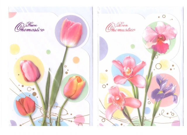 BIGLIETTI A 2 ANTE ONOMASTICO2 SOGGETTI CON BUSTA IN COORDINATO, MIS. CM 11,5X17DECORAZIONI: ( RILIEVO) (TESTO: COLORATO) (STAMPA: OFFSET) (CONFEZIONATE: CELLO SINGOLO)