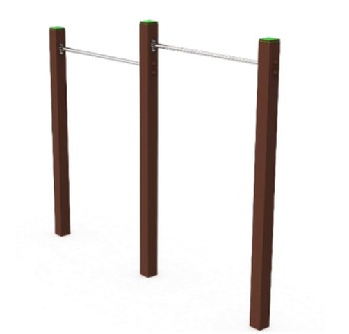 Barra Per Trazioni - Palestra all'aperto- In Plastica Riciclata - Ancoraggio A PavimentoN.B. Tutte le attrezzature sono progettate e realizzate in conformità alle specifiche normative di sicurezza UNI EN 1176 - UNI EN 1177   Attrezzatura fitness per aree all'aperto, barra per trazione con doppia altezza, realizzata con barre orizzontali in acciaio inox e componenti in PEHD e profili di sezioni variabili in plastica proveniente al 100% da raccolta differenziata (certificata PSV da IIP). ferramenta generale in acciaio inox.