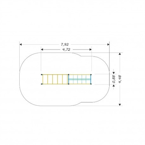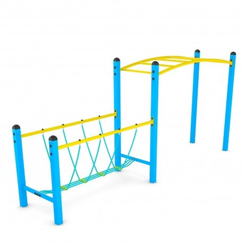 Palestra Per Esercizi Di Coordinamento Ed AbilitàN.B. Tutte le attrezzature sono progettate e realizzate in conformità alle specifiche normative di sicurezza UNI EN 1176 - UNI EN 1177Esercizio di coordinamento ed abilità: appendersi, e passare da una parte all’altra della scala per poi attraversare il ponte in corda esercita un senso di equilibrio.L'attrezzo è costituito da 6 montanti in acciaio profilo 80x80 mm, zincato e verniciato a polvere; viti e dadi nascosti da cappucci colorati in plastica. DATI DIMENSIONALI:Altezza totale: cm 195Altezza di caduta: cm 195Area d’ingombro: cm 474 x 88Spazio minimo: cm 804 x 448 x 345 hArea d’impatto: mq 31,8Età d’uso consigliata: 3/14 anni&n...