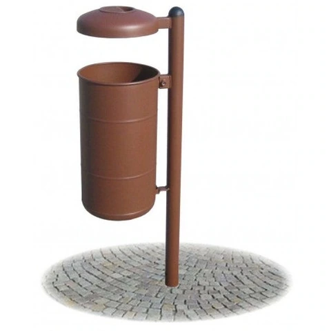 CESTINO CIRCOLARE CON TETTUCCIO E PORTACENERE N.B. Tutte le attrezzature sono progettate e realizzate in conformità alle specifiche normative di sicurezza UNI EN 1176 - UNI EN 1177 Cestello realizzato in lamiera sagomata d’acciaio zincato sp. 10/10 dimensioni cm 30 x 55. Fondo del cestello realizzato mediante disco di lamiera stampato sp. 15/10 con fori per lo scolo delle acque piovane. Palo di sostegno realizzato in tubo tondo d’acciaio zincato Ø mm. 60 x 2 con all’apice copritesta alettato in PE di colore nero.Tettuccio realizzato con disco di lamiera stampato sp. 30/10 dove è ricavato centralmente unospazio per l’inserimento di posacenere estraibile provvisto di elemento spegni-mozziconi. Sistema di svuotamento mediante sgancio con chiave a brugola fornita in dotazione.Le parti in acciaio zincato subiscono dapprima processo di pre-trattamento di sgrassaggio delle impurità attraverso soluzioni a vapori, successivamente asciugate e sottoposte a operazioni di verniciatura mediante pistole elettrostatiche che ricoprono i pezzi di vernice di polvere allo stato farinoso.Successivamente ilmanufatto è sottoposto a polimerizzazione in forno, ovvero, processo che permette alla polvere di solidificarsicocendo ad una temperatura di 180/200° C in un forno a circolazione di aria calda. I pezzi usciti dal fornovengono raffreddati naturalmente.Le polveri utilizzate nel processo di verniciatura sono atossiche secondo normative vigenti. Colorazione RAL a discrezione del cliente. DATI DIMENSIONALIDiametro cesto: cm 30Altezza cesto: cm 41Altezza palo fuori terra: cm 123
