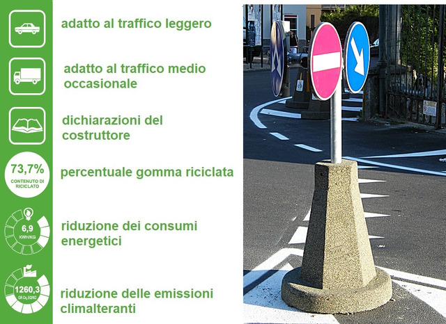 Dissuasore di Sosta in Gomma Riciclata Finitura Finto Granito Grigio Diametro 60cm h 75 cm Senza Accessori Il dissuasore ha una forma innovativa ed è ad elevata visibilità. Il prodotto presenta un foro centrale per il passaggio di un sostegno metallico e può essere corredato da golfari in acciaio zincato (optional). Possibilità di Personalizzazione con logo o stemma stampato in digitale su rifrangente ( ordine minimo PZ. 10 ) al costo di € 12,00UtilitàDelimitatore, dissuasore di sosta o transito supporto per sostegni segnaletici.Materiali CostruttiviMescola con prevalenza di gomma riciclata.ColoriGrigio finto granito.FissaggioTasselli 14 x 140 mm (escluso).Caratteristiche tecnicheDimensioni: altezza 750mm, base diametro 600mm.Norme di riferimentoD.M.n.203 DEL 08/05/2003Codice della Strada (D.Lgs del 30 aprile 1992, n. 285 e successivi aggiornamenti);Decreto del Presidente della Repubblica n.610/96;Ministero delle Infrastrutture e dei Trasporti Note Ispettorato prot.3151/2.