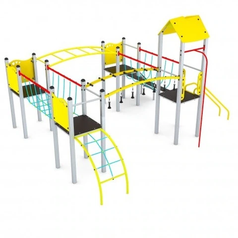 Castello Con Montanti In Tubolare D’Acciaio Con 4 Torri N.B. Tutte le attrezzature sono progettate e realizzate in conformità alle specifiche normative di sicurezza UNI EN 1176 - UNI EN 1177CASTELLO con montanti in tubolare d’acciaio 80x80 mm zincato e verniciato polveri ; tamponamenti, tetto e pannelli in polietilene alta densità PEHD, ponte tibetano con funi Hercules, arrampicate con piani in polietilene e prese d’arrampicata in resina.4 Piani di calpestio in piastra PEHD anti-slittamento 21 mm1 arrampicata “muro”1 tetto in PEHD1 sartia di risalita con montanti curvi in acciaio zincato e verniciato rete  realizzata con funi tipo hercules con anima in acciaio e rivestimento inpoliammide2 ponti realizzati con funi tipo hercules con anima in acciaio e rivestimento in poliammide1 pertica curva1 passaggio aereo ad anelli1 passaggio aereo a pioli1 spalliera orizzontale DATI DIMENSIONALI Altezza partenza scivolo: cm 120 Altezza totale: cm 320 Altezza di caduta: cm 180 Area d’ingombro: cm 458 x 535 Spazio minimo: cm 788 x 835 x 320 h Area d’impatto: mq 68 Età d’uso consigliata: 3/14 anni