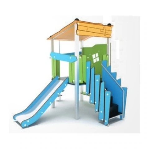 Castello Con Struttura In Tubolare Di Acciaio INOXN.B. Tutte le attrezzature sono progettate e realizzate in conformità alle specifiche normative di sicurezza UNI EN 1176 - UNI EN 1177Castello con struttura in tubolare di acciaio INOX 80x80 mm scivolo con pista in acciaio inossidabile tamponamenti, tetti, pannelli, piani di calpestio e rampe in laminato HPL. Castello costituito da:Piano di calpestio in laminato HPL1 tetto ad 1 falda in laminato HPL1 scivolo dritto con pista in acciaio inox1 panchetta in laminato HPL1 scala a gradini in laminato HPL1 pertica con gradiniDATI DIMENSIONALI   Altezza partenza scivolo: 90 cm Altezza totale: 250 cm Altezza di caduta: 90 cm Area d’ingombro: cm 260 x 264 Spazio minimo: cm 610 x 564 x 250 h Area d’impatto: 39 mq Età d’uso consigliata: 5/14 anni