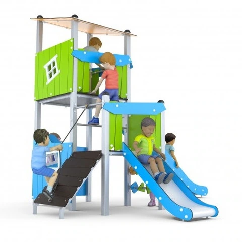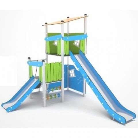 Castello Con Struttura In tubolare Di Acciaio INOXN.B. Tutte le attrezzature sono progettate e realizzate in conformità alle specifiche normative di sicurezza UNI EN 1176 - UNI EN 1177Castello con struttura in tubolare di acciaio INOX 80x80 mm scivolo con pista in acciaio inossidabile tamponamenti, tetti, pannelli, piani di calpestio e rampe in laminato HP. Castello costituito da:Piani di calpestio in laminato HPLPannelli in laminato HPL con inserti finestra1 tetto ad 1 falda in laminato HPL2 scivoli aperti con pista in acciaio inox1 rampa di risalita con fune in laminato HPL1 gioco “pallottoliere”DATI DIMENSIONALI Altezza partenza scivolo: 180 cm Altezza totale: 340 cm Altezza di caduta: 180 cm Area d’ingombro: cm 328 x 437 Spazio minimo: cm 698 x 787 x 340 h Area d’impatto: 56 mq Età d’uso consigliata: 5/14 anni