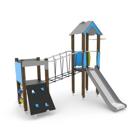 Castello Doppia Torre Con Scivolo Pista In Acciaio Inox e ArrampicateN.B. Tutte le attrezzature sono progettate e realizzate in conformità alle specifiche normative di sicurezza UNI EN 1176 - UNI EN 1177Castello doppia torre con scivolo pista in acciaio inox e arrampicate.Montanti sezione 9x9 cm in lamellare di pino scandinavo trattato in autoclave con staffa a bicchiere punta in acciaio zincato per l’ancoraggio al terreno.Elementi di tamponamento in polietilene alta densità sagomati al pantografo.Composto da:1 tetto a due falde2 piani di calpestio realizzati in multistrato marino con film fenolico antiscivolo1 scivolo con pista in acciaio inox e sponde in PEHD H=120 CM1 rampa con prese e fori per arrampicata H=90 CM1 pertica in acciaio inox con elementi d’appoggio1 sartia in corda con telaio in acciaio inox H=90 CM1 ponte in corda con funi tipo hercules con anima in acciaio e rivestimento in poliammide1 pallottoliere con pannellini verticali in PEHD e tubolare in acciaio inossidabile4 pannelli di protezione in PEHD per scivolo e pertica.2 pannelli di protezione in PEHD per rampa, sartia e pannello arrampicata.2 pannelli di tamponamento DATI DIMENSIONALIAltezza totale: cm 307Altezza di caduta: cm 120Area d’ingombro: cm 364 x 288Spazio minimo: cm 664 x 638 x 457 Area d’impatto: mq 31,1Età d’uso consigliata: 3/14 anniGioco certificato EN1176-2008