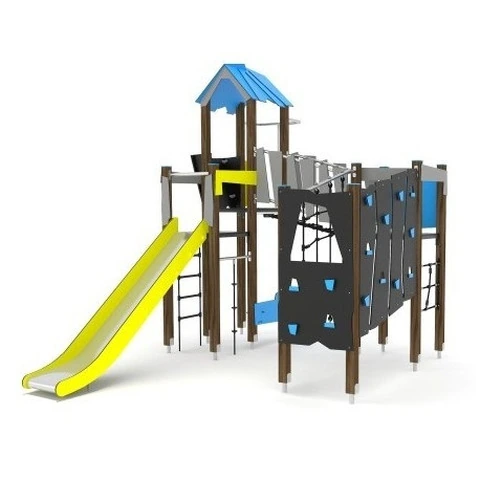 Castello Tre Torri Con Scivolo In Inox E Arrampicate N.B. Tutte le attrezzature sono progettate e realizzate in conformità alle specifiche normative di sicurezza UNI EN 1176 - UNI EN 1177 Castello tre torri, scivolo pista in acciaio inox e arrampicate con montanti sezione 9x9 cm in lamellare  di pino scandinavo trattato in autoclave con staffa a bicchiere punta in acciaio zincato per l’ancoraggio al terreno. Elementi di tamponamento in polietilene alta densità sagomati al pantografo. Composta da: 1 tetto in PEHD (polietilene alta densità) 1 scivolo con pista in acciaio inox e sponde in PEHD H=150 CM 2 pannelli di protezione in PEHD per scivolo. Pannelli con fori e prese d’arrampicata Reti d’arrampicata e scale realizzate con funi tipo hercules con anima in acciaio e rivestimento in poliammide 1 pertica in acciaio inox 2 pannelli di protezione in PEHD per lato palestra e pannello arrampicata. 1 ponte sospeso realizzato con funi tipo hercules con anima in acciaio e rivestimento in poliammide   DATI DIMENSIONALI Altezza totale: cm 370 Altezza di caduta: cm 220 Area d’ingombro: cm 410 x 330 Spazio minimo: cm 760 x 700 x 340 h Area d’impatto: mq 56 Età d’uso consigliata: 3/14 anni