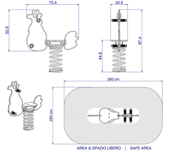 Gallina a Molla in Polietilene per Parco Giochi per Bambini - ITALFROM®N.B. PRODOTTI CERTIFICATI PER ENTI PUBBLICI I giochi a molla ITALFROM® sono ideali per gli spazi dedicati ai bambini per dimenticare tutto ciò che li circonda e lasciare che la loro immaginazione corra senza limiti.  Che si tratti di cavalli, moto oppure tartarughe, da noi può trovare una vasta gamma i giochi a molla dalle più svariate forme e per diverse aree tematiche. I nostri giochi a molla per bambini vi lasceranno sempre con un sorriso e vi faranno sognare. Standard (a cementare) - Con molla H. 400 mm, Ø180mm, filo 17.5 mmQuesta variante indica il gioco a molla completo. Include la base per il fissaggio nel terreno tramite fondazione, la molla con diametro 180mm ed altezza 400mm, l'intera sagoma e tutta la viteria necessaria per il montaggio. Questo tipo di molla è solitamente usata in scuole, asili, giardini privati o parchi dove le strutture gioco sono supervisionate da genitori o insegnanti.Misura: 88 x 29 x H 59 cm  Peso: 20,20 kg  Imballo: 0,15 mcStaffa OMEGA (a tassellare) - Con molla H. 400 mm, Ø180mm, filo 17.5 mm Questa variante indica il gioco a molla completo. Include la base per il fissaggio su superfici rigide come cemento, la molla con diametro 180mm ed altezza 400mm, l'intera sagoma e tutta la viteria necessaria per il montaggio. Questo tipo di molla è solitamente usata per aree pubbliche o parchi dove le strutture gioco non sono supervisionate. La viteria per il fissaggio a terra non viene fornita. Essa dipende dalla tipologia di superficie e viene solitamente scelta dall'installatore.Misura: 88 x 29 x H 59 cm  Peso: 19,30 kg  Imballo: 0,15 mcDescrizione• Età d’uso : 0 – 12 anni.• Adatto per aree pubbliche, scuole, area gioco privata o condominiale.• I nostri prodotti sono progettati e costruiti in conformità alla normativa EN1176 e certificati da enti terzi competenti.Componenti :• Sagoma in polietilene estruso “ CHIMALON “, colorato in massa e resistente agli UV con un valore di 8 ( scala di lana da 1 a 8 ) e riciclabile al 100 %.• Accessori quali manopole e copridadi sono realizzati in polietilene con le stesse caratteristiche della sagoma.• La molla ( filo 18 mm ) con collegamento attraverso lo spring-disk è realizzata dalla ditta Eibach, azienda leader in Europa nella costruzione di molle.• Elemento di collegamento realizzato in polietilene pressato multicolor.• Staffa da interrare realizzata in FE zincata a caldo.• Bulloneria in acciaio zincato o inox.• Tutti i componenti del gioco sono disponibili come parti di ricambio.• Posa in opera : Attenersi alla illustrazione in allegato al gioco.Piano di manutenzione ( come richiesto dalla normativa EN 1176-7 ) :• Ispezione visiva : tenere controllato il buon stato generale del gioco.• Ispezione semestrale : controllare il serraggio dei bulloni e lo stato generale del gioco, inoltre verificare che lo spazio libero sia rispettato e che la fondazione del gioco non sia scoperto dal terreno.• Ispezione annuale : verificare l'integrità strutturale dei plinti di fondazioneCARATTERISTICHE TECNICHEISTRUZIONI DI MONTAGGIO