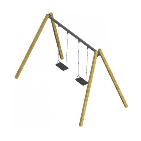 Gioco Altalena Con Due Seggiolini Piani Rivestiti In Gomma Certificata EN 1176N.B. Tutte le attrezzature sono progettate e realizzate in conformità alle specifiche normative di sicurezza UNI EN 1176 - UNI EN 1177 Altalena a due posti, struttura costituita da una trave di sostegno in ferro rettangolare da 8 x 5 L=290 cm zincata a caldo alla quale vengono fissati i giunti di sostegno del sedile; 4 montanti in lamellare di pino nordico impregnato a sali in autoclave come da norme DIN 68800 e RAL, di sez. 90x90 mm con bordi raggiati minimo raggio 3 e speciale doppia fresatura su ciascun lato atta a convogliare le naturali fessurazioni del legno eliminando qualunque rischio di scheggiatura, 2 sedili a tavoletta tipo C/13, con anima in acciaio e catene zincate a caldo, a norma DIN 766/A diam. 6 mm a maglia corta che impedisce l’intrappolamento delle dita del bambino.Questo sedile è molto sicuro dato l’alto assorbimento dell’impatto, zigrinatura anti-scivolo e assenza di protuberanze, bordi di contorno soffici ed a prova di scheggia; internamente è rinforzato da una struttura di acciaio tenero. DATI DIMENSIONALI Altezza traversa: cm 200 Altezza di caduta: cm 120 Area d’ingombro: cm 200 x 345 Spazio minimo: cm 728 x 345 x 270 h Area d’impatto: mq 21 Età d’uso consigliata: 3/12 anni