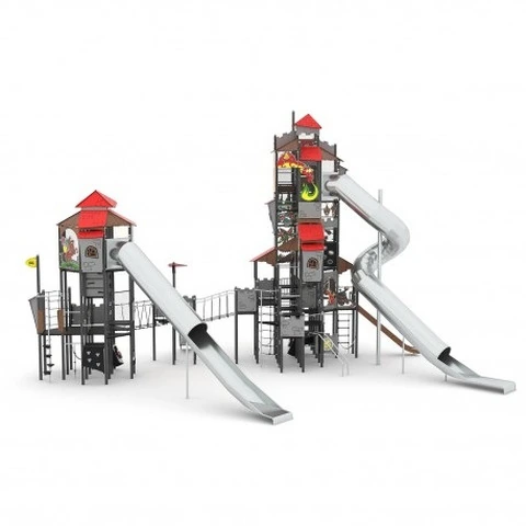 Gioco Castello A 2 Torri E Vari Giochi Come Scivolo Arrampicate Ponte Tibetano N.B. Tutte le attrezzature sono progettate e realizzate in conformità alle specifiche normative di sicurezza UNI EN 1176 - UNI EN 1177 Torre castello, struttura in acciaio con un profilo di 80x80 mm, zincata e verniciata a polvere o in alternativa acciaio inossidabile.Piattaforme e pareti d'arrampicata realizzate con durevoli lastre HPL antiscivolo e impermeabili.Tetti, pannelli laterali, elementi mobili, bandiera e pannello musicale realizzati in HDPE, resistente agli agenti atmosferici.Viti ricoperte con tappi in plastica o viti in acciaio inossidabile.Barre e corrimano in acciaio inossidabile.Catene calibrate in acciaio inox che evitano l'intrappolamento delle dita. Attrezzature destinate a parchi giochi pubblici;Certificato rilasciato da un ente accreditato o una dichiarazione di conformità. Il rendering è solo di riferimento, l'aspetto effettivo dell'attrezzatura e il suo colore possono variare. Composta da:1 bandiera in HDPE1 Pedana di risalita in HPLDATI DIMENSIONALI Altezza totale: cm 900 Altezza di caduta: 270 Area d’ingombro: cm 1530 x 1321 Spazio minimo: cm 1831 x 1692 x 1050h Area d’impatto: mq 139,5 Età d’uso consigliata: 4 - 14 anni