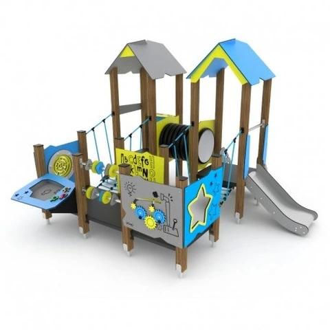 Gioco Multiproposta Inclusivo Percorso Accessibile Anche Alle Carrozzine Con Pannelli Interattivi N.B. Tutte le attrezzature sono progettate e realizzate in conformità alle specifiche normative di sicurezza UNI EN 1176 - UNI EN 1177Gioco multi proposta inclusivo percorso accessibile anche alle carrozzine pannelli interattivi, montanti sezione 9x9 cm in lamellare di pino scandinavo trattato in autoclave con staffa a bicchiere punta in acciaio zincato per l’ancoraggio al terreno.Elementi di tamponamento in polietilene alta densità sagomati al pantografo.Composto da:1 scivolo h=60 cm con pista in acciaio inox fianchi in polietilene ad alta densità.1 scala con gradini ad h=60 cm, corrimano in polietilene ad alta densità.1 rampa multistrato marino con rivestimento fenolico antiscivolo plywood montanti in lamellare di pino nordico sez. 90x90 mm con staffa in acciaio zincato per l’ancoraggio al terreno.5 piani di calpestio realizzati in multistrato antiscivolo plywood2 tetti in PEHD (polietilene alta densità)2 ponti in corda tipo hercules con anima in acciaio e rivestimento in poliammide6 pannelli di tamponamento interattivi1 gioco carrucola1 tunnel a doppia parete in polipropileneDATI DIMENSIONALI Altezza totale: cm 247Altezza di caduta: cm