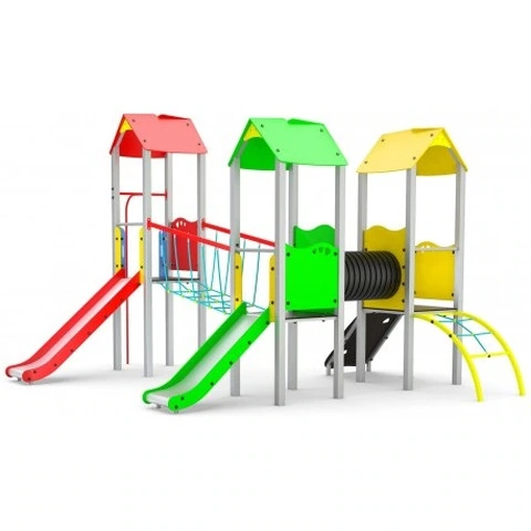 Gioco Per Parchi Castello Gioco Multiproposta Con ScivoliN.B. Tutte le attrezzature sono progettate e realizzate in conformità alle specifiche normative di sicurezza UNI EN 1176 - UNI EN 1177 Gioco per parchi con diverse altezze di gioco, a tre torri castello con scivoli, pertica dei pompieri, parete di arrampicata, ponte in corda,tunnel e rete di arrampicata.Scivoli con pista in acciaio inox e fianchi in polietilene alta densità PEHD, montanti in tubolare d’acciaio 80x80 mm zincato e verniciato polveri; tamponamenti, tetti e pannelli in polietilene alta densità PEHD, ponte tibetano con funi Hercules, arrampicate con piani in polietilene e prese d’arrampicata in resina, ponte tunnel a doppia parete in polipropilene.3 Piani di calpestio in piastra PEHD antislittamento 21 mm1 scivolo con partenza pista ad altezza 150 cm1 scivolo con partenza pista ad altezza 90 cm1 arrampicata “muro”1 ponte tunnel a doppia parete in polipropilene.3 tetti in PEHD1 sartia di risalita con montanti curvi in acciaio zincato e verniciato rete realizzata con funi tipo hercules con anima in acciaio e rivestimento in poliammide1 ponte realizzato con funi tipo hercules con anima in acciaio e rivestimento in poliammide1 pertica curva DATI DIMENSIONALI Altezza partenza scivolo: cm 120/90 Altezza totale: cm 320 Altezza di caduta: cm 120 Area d’ingombro: cm 499 x 439 Spazio minimo: cm 799 x 789 x 320 h Area d’impatto: mq 64 Età d’uso consigliata: 3/14 anni