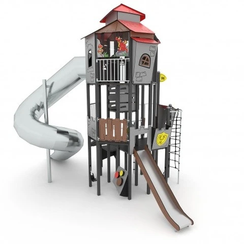 Gioco Torre Castello Con Scivolo Tunnel N.B. Tutte le attrezzature sono progettate e realizzate in conformità alle specifiche normative di sicurezza UNI EN 1176 - UNI EN 1177 Torre castello, struttura in acciaio con un profilo di 80x80 mm, zincata e verniciata a polvere o in alternativa acciaio inossidabile.Piattaforme e pareti d'arrampicata realizzate con durevoli lastre HPL antiscivolo e impermeabili.Tetti, pannelli laterali, elementi mobili, bandiera e pannello musicale realizzati in HDPE, resistente agli agenti atmosferici.Viti ricoperte con tappi in plastica o viti in acciaio inossidabile.Barre e corrimano in acciaio inossidabile.Catene calibrate in acciaio inox che evitano l'intrappolamento delle dita. Attrezzature destinate a parchi giochi pubblici;Certificato rilasciato da un ente accreditato o una dichiarazione di conformità. Il rendering è solo di riferimento, l'aspetto effettivo dell'attrezzatura e il suo colore possono variare. Composta da:1 bandiera in HDPE1 Pedana di risalita in HPLDATI DIMENSIONALI Altezza totale: cm 613 Altezza di caduta: 270 Area d’ingombro: cm 742 x 563 Spazio minimo: cm 1142 x 727 x 763h Area d’impatto: mq 51,5 Età d’uso consigliata: 4 - 14 anni