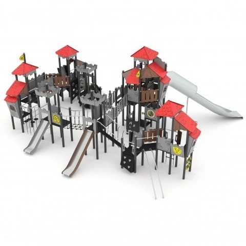 Gioco Torre Castello Grande Con Percorsi Ludici N.B. Tutte le attrezzature sono progettate e realizzate in conformità alle specifiche normative di sicurezza UNI EN 1176 - UNI EN 1177 Torre castello, struttura in acciaio con un profilo di 80x80 mm, zincata e verniciata a polvere o in alternativa acciaio inossidabile.Piattaforme e pareti d'arrampicata realizzate con durevoli lastre HPL antiscivolo e impermeabili.Tetti, pannelli laterali, elementi mobili, bandiera e pannello musicale realizzati in HDPE, resistente agli agenti atmosferici.Viti ricoperte con tappi in plastica o viti in acciaio inossidabile.Barre e corrimano in acciaio inossidabile.Catene calibrate in acciaio inox che evitano l'intrappolamento delle dita. Attrezzature destinate a parchi giochi pubblici;Certificato rilasciato da un ente accreditato o una dichiarazione di conformità. Il rendering è solo di riferimento, l'aspetto effettivo dell'attrezzatura e il suo colore possono variare. Composta da:1 bandiera in HDPE1 Pedana di risalita in HPLDATI DIMENSIONALI Altezza totale: cm 490 Altezza di caduta: 240 Area d’ingombro: cm 1112 x 1021 Spazio minimo: cm 1434 x 1392 x 640h Area d’impatto: mq 174,7 Età d’uso consigliata: 4 - 14 anni