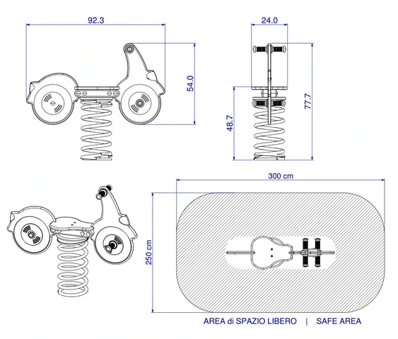 Moto a Molla in Polietilene per Parco Giochi per Bambini - ITALFROM®N.B. PRODOTTI CERTIFICATI PER ENTI PUBBLICI I giochi a molla ITALFROM® sono ideali per gli spazi dedicati ai bambini per dimenticare tutto ciò che li circonda e lasciare che la loro immaginazione corra senza limiti.  Che si tratti di cavalli, moto oppure tartarughe, da noi può trovare una vasta gamma i giochi a molla dalle più svariate forme e per diverse aree tematiche. I nostri giochi a molla per bambini vi lasceranno sempre con un sorriso e vi faranno sognare. Standard (a cementare) - Molla H. 400 mm, Ø200mm, filo 20 mmQuesta variante indica il gioco a molla completo. Include la base per il fissaggio nel terreno tramite fondazione (art. 116 del listino), la molla con diamentro 200mm ed altezza 400mm, l'intera sagoma e tutta la viteria necessaria per il montaggio. Questo tipo di molla è solitamente usata per aree pubbliche o parchi dove le strutture gioco non sono supervisionate.Misura: 88 x 29 x H 59 cm  Peso: 25,10 kg  Imballo: 0,15 mcCon Molla (a cementare) - H. 360 mm, Ø180mm, filo 17.5 mmQuesta variante indica il gioco a molla completo. Include la base per il fissaggio nel terreno tramite fondazione (art. 116 del listino), la molla con diametro 180mm ed altezza 360mm, l'intera sagoma e tutta la viteria necessaria per il montaggio. Questo tipo di molla è solitamente usata in scuole, asili, giardini privati o parchi dove le strutture gioco sono supervisionate da genitori o insegnanti.Misura: 88 x 29 x H 59 cm  Peso: 20,40 kg  Imballo: 0,15 mcCon molla (a tassellare) - H. 400 mm, Ø200mm e staffa OMEGA, filo 20 mmQuesta variante indica il gioco a molla completo. Include la base per il fissaggio su superfici rigide come cemento (art. 125 del listino), la molla con diametro 200mm ed altezza 400mm, l'intera sagoma e tutta la viteria necessaria per il montaggio.Questo tipo di molla è solitamente usata per aree pubbliche o parchi dove le strutture gioco non sono supervisionate.La viteria per il fissaggio a terra non viene fornita. Essa dipende dalla tipologia di superficie e viene solitamente scelta dall'installatore.Misura: 88 x 29 x H 59 cm  Peso: 24,20 kg  Imballo: 0,15 mcCon molla (a tassellare) - H. 360 mm, Ø180mm e staffa OMEGA, filo 17.5 mmQuesta variante indica il gioco a molla completo. Include la base per il fissaggio in superfici rigide come cemento (art. 125 del listino), la molla con diametro 180mm ed altezza 360mm, l'intera sagoma e tutta la viteria necessaria per il montaggio.Questo tipo di molla è solitamente usata in scuole, asili, giardini privati o parchi dove le strutture gioco sono supervisionate da genitori o insegnanti.La viteria per il fissaggio a terra non viene fornita. Essa dipende dalla tipologia di superficie e viene solitamente scelta dall'installatore.Misura: 88 x 29 x H 59 cm  Peso: 19,50 kg  Imballo: 0,15 mcDescrizione• Età d’uso : 0 – 12 anni.• Adatto per aree pubbliche, scuole, area gioco privata o condominiale.• I nostri prodotti sono progettati e costruiti in conformità alla normativa EN1176 e certificati da enti terzi competenti.Componenti :• Sagoma in polietilene estruso “ CHIMALON “, colorato in massa e resistente agli UV con un valore di 8 ( scala di lana da 1 a 8 ) e riciclabile al 100 %.• Accessori quali manopole e copridadi sono realizzati in polietilene con le stesse caratteristiche della sagoma.• La molla ( filo 18 mm ) con collegamento attraverso lo spring-disk è realizzata dalla ditta Eibach, azienda leader in Europa nella costruzione di molle.• Elemento di collegamento realizzato in polietilene pressato multicolor.• Staffa da interrare realizzata in FE zincata a caldo.• Bulloneria in acciaio zincato o inox.• Tutti i componenti del gioco sono disponibili come parti di ricambio.• Posa in opera : Attenersi alla illustrazione in allegato al gioco.Piano di manutenzione ( come richiesto dalla normativa EN 1176-7 ) :• Ispezione visiva : tenere controllato il buon stato generale del gioco.• Ispezione semestrale : controllare il serraggio dei bulloni e lo stato generale del gioco, inoltre verificare che lo spazio libero sia rispettato e che la fondazione del gioco non sia scoperto dal terreno.• Ispezione annuale : verificare l'integrità strutturale dei plinti di fondazioneCARATTERISTICHE TECNICHEISTRUZIONI DI MONTAGGIO