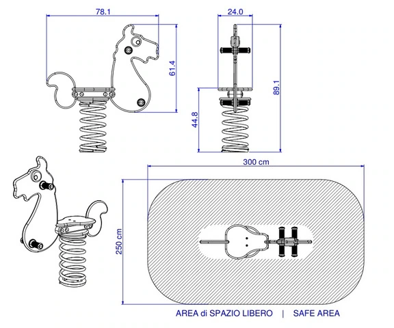 Pony a Molla in Polietilene per Parco Giochi per Bambini - ITALFROM®N.B. PRODOTTI CERTIFICATI PER ENTI PUBBLICI I giochi a molla ITALFROM® sono ideali per gli spazi dedicati ai bambini per dimenticare tutto ciò che li circonda e lasciare che la loro immaginazione corra senza limiti. Che si tratti di cavalli, moto oppure tartarughe, da noi può trovare una vasta gamma i giochi a molla dalle più svariate forme e per diverse aree tematiche. I nostri giochi a molla per bambini vi lasceranno sempre con un sorriso e vi faranno sognare. Standard (a cementare) - Con molla H. 400 mm, Ø180mm, filo 17.5 mmQuesta variante indica il gioco a molla completo. Include la base per il fissaggio nel terreno tramite fondazione, la molla con diametro 180mm ed altezza 400mm, l'intera sagoma e tutta la viteria necessaria per il montaggio. Questo tipo di molla è solitamente usata in scuole, asili, giardini privati o parchi dove le strutture gioco sono supervisionate da genitori o insegnanti.Misura: 88 x 29 x H 59 cm Peso: 20,30 kg Imballo: 0,15 mcStaffa OMEGA (a tassellare) - Con molla H. 400 mm, Ø180mm, filo 17.5 mm Questa variante indica il gioco a molla completo. Include la base per il fissaggio su superfici rigide come cemento, la molla con diametro 180mm ed altezza 400mm, l'intera sagoma e tutta la viteria necessaria per il montaggio. Questo tipo di molla è solitamente usata per aree pubbliche o parchi dove le strutture gioco non sono supervisionate. La viteria per il fissaggio a terra non viene fornita. Essa dipende dalla tipologia di superficie e viene solitamente scelta dall'installatore.Misura: 88 x 29 x H 59 cm Peso: 19,40 kg Imballo: 0,15 mcDescrizione• Età d’uso : 0 – 12 anni.• Adatto per aree pubbliche, scuole, area gioco privata o condominiale.• I nostri prodotti sono progettati e costruiti in conformità alla normativa EN1176 e certificati da enti terzi competenti.Componenti :• Sagoma in polietilene estruso “ CHIMALON “, colorato in massa e resistente agli UV con un valore di 8 ( scala di lana da 1 a 8 ) e riciclabile al 100 %.• Accessori quali manopole e copridadi sono realizzati in polietilene con le stesse caratteristiche della sagoma.• La molla ( filo 18 mm ) con collegamento attraverso lo spring-disk è realizzata dalla ditta Eibach, azienda leader in Europa nella costruzione di molle.• Elemento di collegamento realizzato in polietilene pressato multicolor.• Staffa da interrare realizzata in FE zincata a caldo.• Bulloneria in acciaio zincato o inox.• Tutti i componenti del gioco sono disponibili come parti di ricambio.• Posa in opera : Attenersi alla illustrazione in allegato al gioco.Piano di manutenzione ( come richiesto dalla normativa EN 1176-7 ) :• Ispezione visiva : tenere controllato il buon stato generale del gioco.• Ispezione semestrale : controllare il serraggio dei bulloni e lo stato generale del gioco, inoltre verificare che lo spazio libero sia rispettato e che la fondazione del gioco non sia scoperto dal terreno.• Ispezione annuale : verificare l'integrità strutturale dei plinti di fondazioneCARATTERISTICHE TECNICHEISTRUZIONI DI MONTAGGIO