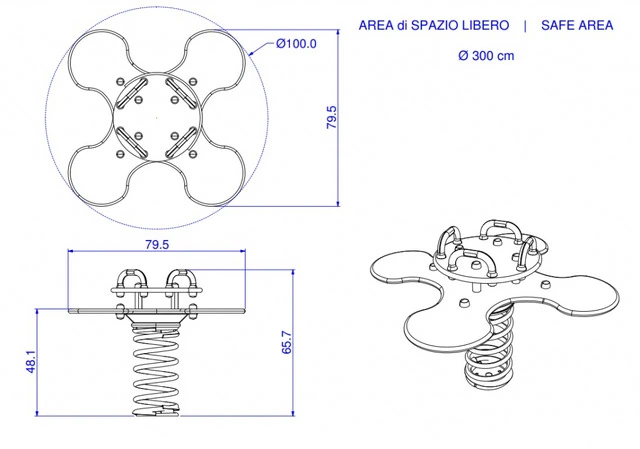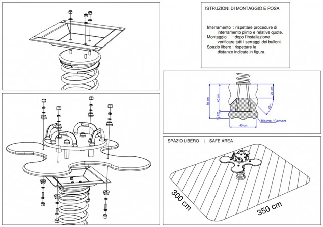 Quadrifoglio Small a Molla in Polietilene per Parco Giochi per Bambini - ITALFROM®N.B. PRODOTTI CERTIFICATI PER ENTI PUBBLICI I giochi a molla ITALFROM® sono ideali per gli spazi dedicati ai bambini per dimenticare tutto ciò che li circonda e lasciare che la loro immaginazione corra senza limiti.  Che si tratti di cavalli, moto oppure tartarughe, da noi può trovare una vasta gamma i giochi a molla dalle più svariate forme e per diverse aree tematiche. I nostri giochi a molla per bambini vi lasceranno sempre con un sorriso e vi faranno sognare. Standard (a cementare) - Molla H. 400 mm, Ø200mm, filo 20 mmQuesta variante indica il gioco a molla completo. Include la base per il fissaggio nel terreno tramite fondazione (art. 116 del listino), la molla con diamentro 200mm ed altezza 400mm, l'intera sagoma e tutta la viteria necessaria per il montaggio. Questo tipo di molla è solitamente usata per aree pubbliche o parchi dove le strutture gioco non sono supervisionate.Misura: 88 x 29 x H 59 cm  Peso: 25,10 kg  Imballo: 0,15 mcCon molla (a tassellare) - H. 400 mm, Ø200mm e staffa OMEGA, filo 20 mmQuesta variante indica il gioco a molla completo. Include la base per il fissaggio su superfici rigide come cemento (art. 125 del listino), la molla con diametro 200mm ed altezza 400mm, l'intera sagoma e tutta la viteria necessaria per il montaggio.Questo tipo di molla è solitamente usata per aree pubbliche o parchi dove le strutture gioco non sono supervisionate.La viteria per il fissaggio a terra non viene fornita. Essa dipende dalla tipologia di superficie e viene solitamente scelta dall'installatore.Misura: 88 x 29 x H 59 cm  Peso: 24,20 kg  Imballo: 0,15 mcDescrizione• Età d’uso : 0 – 12 anni.• Adatto per aree pubbliche, scuole, area gioco privata o condominiale.• I nostri prodotti sono progettati e costruiti in conformità alla normativa EN1176 e certificati da enti terzi competenti.Componenti :• Sagoma in polietilene estruso “ CHIMALON “, colorato in massa e resistente agli UV con un valore di 8 ( scala di lana da 1 a 8 ) e riciclabile al 100 %.• Accessori quali manopole e copridadi sono realizzati in polietilene con le stesse caratteristiche della sagoma.• La molla ( filo 18 mm ) con collegamento attraverso lo spring-disk è realizzata dalla ditta Eibach, azienda leader in Europa nella costruzione di molle.• Elemento di collegamento realizzato in polietilene pressato multicolor.• Staffa da interrare realizzata in FE zincata a caldo.• Bulloneria in acciaio zincato o inox.• Tutti i componenti del gioco sono disponibili come parti di ricambio.• Posa in opera : Attenersi alla illustrazione in allegato al gioco.Piano di manutenzione ( come richiesto dalla normativa EN 1176-7 ) :• Ispezione visiva : tenere controllato il buon stato generale del gioco.• Ispezione semestrale : controllare il serraggio dei bulloni e lo stato generale del gioco, inoltre verificare che lo spazio libero sia rispettato e che la fondazione del gioco non sia scoperto dal terreno.• Ispezione annuale : verificare l'integrità strutturale dei plinti di fondazioneCARATTERISTICHE TECNICHEISTRUZIONI DI MONTAGGIO