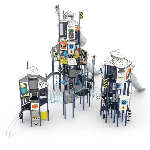 Struttura Grande Composta Da 4 Torri E Tanti Giochi N.B. Tutte le attrezzature sono progettate e realizzate in conformità alle specifiche normative di sicurezza UNI EN 1176 - UNI EN 1177 Struttura in acciaio zincato e verniciato a polvere o acciaio inossidabile di 80 x 80 cmPiattaforme e pareti da arrampicata realizzate in resistente piastra HPL antiscivolo e impermeabileTetti e pannelli laterali realizzati in durevole lastra HDPE, resistente alle condizioni atmosferichePannelli in policarbonato trasparente con una stampa permanente resistente ai graffi e condizioni meteorologicheScivoli in acciaio inossidabile con pannelli laterali in HDPE resistentiPannelli didattici ed elementi mobili realizzati in lamiera HDPE, resistente a condizioni meteoTavolo da disegno realizzato con lastra HPL durevole, resistente agli agenti atmosfericiFinestre a labirinto in policarbonato, sfere in materiale sinteticoPietre durevoli per l'arrampicata in composito di resina poliestere con cariche mineraliFuni d'acciaio in treccia di polipropilene, collegate con elementi in plastica resistente, acciaio inossidabile o alluminioSedili certificati e sicuriBarre, scale e corrimano in acciaio inossidabileViti in acciaio inox e / o viti ricoperte con tappi in plasticaTestate sicure sulla parte superiore della struttura in gomma o polipropileneDATI DIMENSIONALILunghezza: cm 1527Larghezza : cm 1515Altezza totale: cm 950Altezza di caduta: cm 270Spazio minimo: cm 1833 x 1838 x 1100hArea d’impatto: mq 174,3Età d’uso consigliata: 4/14 anni
