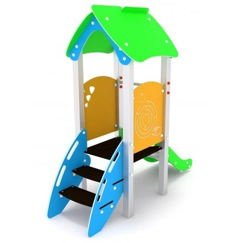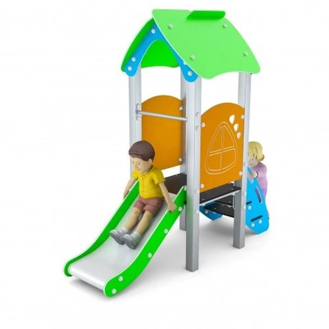 Torretta Scivolo Adatta Alla Prima Infanzia 564 x 396 x H 215 cm N.B. Tutte le attrezzature sono progettate e realizzate in conformità alle specifiche normative di sicurezza UNI EN 1176 - UNI EN 1177 Gioco per parchi pubblici e giardini con montanti in tubolare di acciaio inox sezione 80x80 mm elementi di tamponamento in polietilene alta densità sagomato al pantografo.Piani di calpestio in polietilene alta densità PEHD con superficie antiscivolamento. Composta da: 1 torretta con piano di calpestio ad altezza 60 cm realizzato in PEHD anti scivolo1 tetto in PEHD (polietilene alta densità)1 scaletta in PEHD (polietilene alta densità)1 scivolo con pista in acciaio inossidabile e spalle in polietilene alta densità2 pannelli di tamponamento DATI DIMENSIONALI Altezza partenza scivolo: cm 60 Altezza totale: cm 215 Altezza di caduta: cm 60 Area d’ingombro: cm 214 x 96 Spazio minimo: cm 564 x 396 x 215 h Area d’impatto: mq 24 Età d’uso consigliata: 1/8 anni