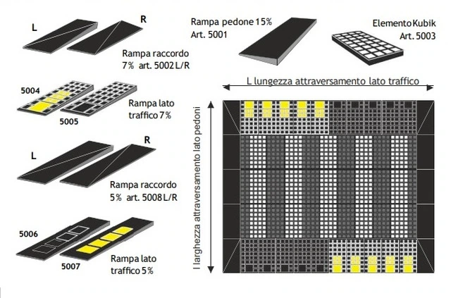 Attraversamenti Pedonali in Gomma Riciclata composti da Moduli Componibili Eco-sostenibili in Gomma Kubik e Blocchetti in Calcestruzzo L'attraversamento pedonale è una sopraelevazione della carreggiata dotata di rampe. Lo scopo di quest'articolo è duplice: mettere in sicurezza gli utenti deboli, in particolare i pedoni, aumentandone la visibilità e costringere gli automobilisti a rallentare in prossimità di un passaggio pedonale. L'attraversamento rialzato è realizzato con moduli in gomma riciclata. La modularità del prodotto consente una rapida installazione e facilita le operazioni di manutenzione. La tavola centrale è composta dagli elementi in gomma Kubik, brevetto depositato, dotati di blocchetti in calcestruzzo, che aumentano la resistenza all’usura della piattaforma e richiamano i sanpietrini, presenti nella maggior parte dei centri storici italiani, consentendo al passaggio pedonale di armonizzarsi con il contesto. Inoltre ha lo scopo di incrementare la visibilità notturna dell’attraversamento pedonale, sulle rampe veicolari in ingresso sono applicati inserti in elastoplastico rifrangente.UtilitàIl prodotto ha la funzione di mettere in sicurezza gli utenti deboli, in particolare i pedoni, aumentandone la visibilità e costringere gli automobilisti a rallentare in prossimità di un passaggio pedonale.Modalità d'installazioneTracciare una linea perpendicolare al margine dal quale si vuole iniziare la posa della tavola centrale rialzata ed un’altra parallela alla precedente, distanziata della larghezza complessiva del piano rialzato che si intende realizzare. Sistemare a contorno le rampe d’ingresso e di uscita e, se previste, anche quelle di raccordo lato pedone. Fissare al suolo con i tasselli forniti. Successivamente: inserire gli elementi Kubik componenti la tavola centrale; fissare con i tasselli; inserire i tappi ed infine inserire i blocchetti in cls. con l’ausilio di un mazzuolo in gomma.Materiali CostruttiviGomma riciclataCalcestruzzoColoriElementi in gomma Kubik: neroBlocchetti in calcestruzzo: bianco - antracite - giallo ocra - rosso mattoneFissaggio4 Tasselli di fissaggio 12x160 completi di tirafondi e rondelleCubetti in CalcestruzzoTappi in Gomma per la chiusura degli alloggiamenti dei tasselli presenti nei moduli KubikCaratteristiche tecnicheNorme di riferimentoD.M. 5 Febbraio 2015 (Criteri ambientali minimi per l'acquisto di articoli per l'arredo urbano)D.M. 8 Maggio 2003, n. 203D.M. 5 Novembre 2001, n.6792 Ministero delle infrastrutture e dei Trasporti, prot. nr. 2867/2001 Ministero delle Infrastrutture e dei Trasporti, prot. nr. 842/2006