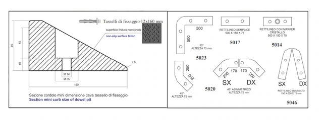 Cordolo 'Mini' Multifunzione Costituiti da Elementi Componiibili in Gomma 'Mini' è un cordolo stradale cuneiforme eco-sostenibile, costituito per oltre il 90% di gomma riciclata. Per fornire una visibilità ottimale del prodotto, a richiesta, può essere verniciato con vernice poliuretanica per aumentare la resistenza agli agenti atmosferici. Al centro dell’elemento lineare è possibile inserire un marker in cristallo. Mini è un cordolo multifunzionale che può essere utilizzato sia per la delimitazione di marciapiedi, aiuole, isole di traffico, rotatorie a pianta ottagonale (modello Mosaico), che per la realizzazione di restringimenti della carreggiata per rallentare il traffico. Inoltre è la versione ridotta del cordolo 'Maxi', mantenendo le medesime caratteristiche, ha dimensioni più contenute,500x150 mm, l'altezza 75 mm. E' inoltre utilizzato per la perimetrazione di tutti i moduli Kubik. Disponibile in elementi rettilinei, a 90° o 45°, e una coppia di terminali ad angolazione variabile per la formazione delle cuspidi o per la partenza del cordolo affiancato. Possibilità di essere fornito con marker in cristallo. UtilitàIl prodotto ha la funzione di delimitare marciapiedi,aiutole, isole di traffico, rotatorie. Inoltre occorre per la realizzazione di restringimenti della carreggiata per rallentare il traffico. Modalità d'installazioneAncorare il cordolo Mini al suolo con n. 2 tasselli 12x160 mm (n. 4 tasselli 12x160 mm per gli elementi a 90°).Materiali CostruttiviGomma riciclataColoriElementi in gomma: nero - giallo - rosso - biancoFissaggio2 Tasselli di fissaggio 12x160 completi di tirafondi e rondelle (4 tasselli 12x160 mm per gli elementi a 90°)Su richiesta: Marker in cristalloCaratteristiche tecnicheNorme di riferimentoArt. 176 del Regolamento di Esecuzione e di Attuazione del Codice della StradaArt. 177 del Regolamento di Esecuzione e di Attuazione del Codice della StradaMinistero delle Infrastrutture e dei Trasporti, prot. nr.3151 del 30 dicembre 2002D.M. 5 Febbraio 2015 (Criteri ambientali minimi per l'acquisto di articoli per l'arredo urbano)D.M. 8 Maggio 2003, n. 203D.M. 5 Novembre 2001, n.6792