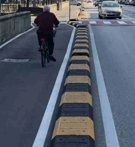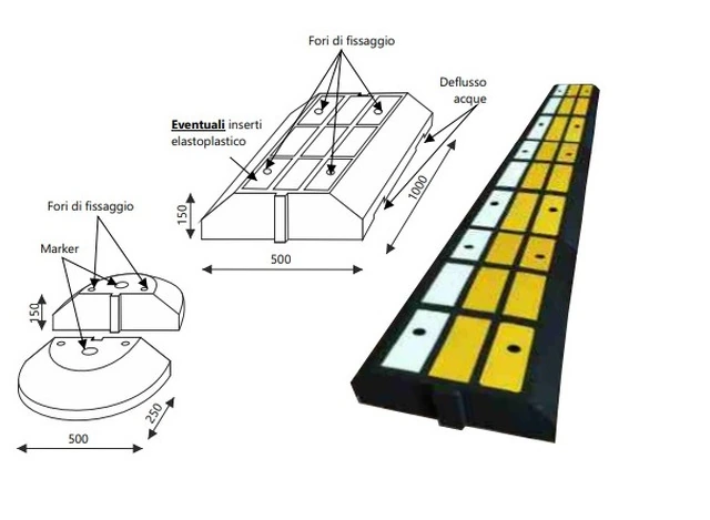 Cordolo Separatore di Corsia ' Biker SP / Biker SPE ' in Gomma Riciclata con Inserti Rifrangenti Dim. 1000 X 500 h 150 mm 'Biker SP/SPE' è un cordolo separatore di corsia progettato per la delimitazione delle piste ciclabili nel rispetto dell'articolo 7, comma 4, del Decreto ministeriale del 30 novembre 1999, n.557, Regolamento per la definizione delle caratteristiche tecniche delle piste ciclabili, nel quale si afferma che qualora la pista ciclabile presenti verso discorde all'adiacente corsia di marcia degli autoveicoli, oppure sia realizzata in sede propria, deve essere separata dalla carreggiata degli autoveicoli adiacente attraverso uno spartitraffico invalicabile largo almeno 50 cm. L’elemento centrale ha pianta rettangolare ed è dotato di scanalature per inserire, a richiesta, rifrangenti in elastoplastico bianchi e/o gialli. Tutti gli elementi centrali sono dotati, nella parte sottostante, di apposite vie di drenaggio. L’elemento terminale ha la testa arrotondata ed è dotato di un marker in cristallo. Entrambi gli elementi, a richiesta, possono essere verniciati con vernice poliuretanica di colore giallo per aumentarne la visibilità.Il prodotto può essere posato in tempi molto rapidi, anche in presenza di traffico senza particolari attrezzature. I raccordi laterali sono quasi verticali e risultano difficilmente sormontabili. Conforme al D.M. 557 E D.M. n° 203 .UtilitàIl prodotto ha la funzione di delimitare le piste ciclabili, in modo tale da essere separate dalla carreggiata.Materiali CostruttiviGomma parzialmente riciclata, marker in cristallo.ColoriElementi in gomma: nero - gialloInserti in elastoplastico: giallo - biancoFissaggio4 Tasselli di fissaggio 12x160 completi di tirafondi e rondelleCaratteristiche tecnicheNorme di riferimentoD.M. 5 Febbraio 2015 (Criteri ambientali minimo per l'acquisto di articoli per l'arredo urbano)D.M. 8 Maggio 2003, n.203D.M. 30 Novembre 1999, n.557