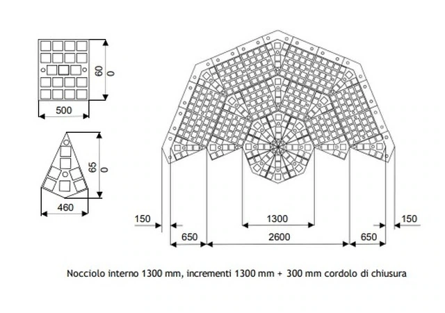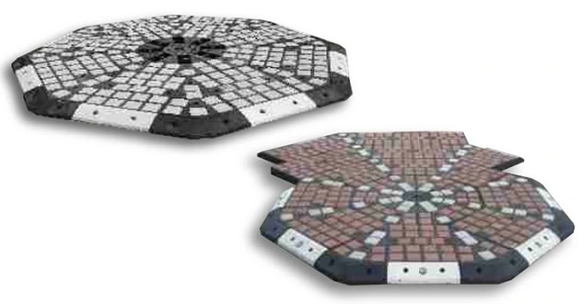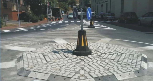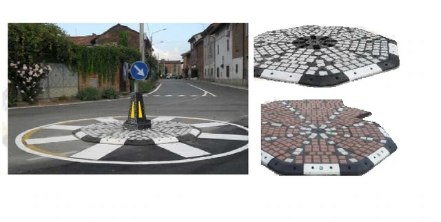 Rotatoria componibile 'Mosaico' in Gomma Riciclata composta da Moduli Componibili Eco-sostenibili a Pianta Ottagonale con Blocchetti in Calcestruzzo Diam. minimo 1500 mm Mosaico è una rotatoria modulare a pianta ottagonale, ogni modulo è realizzato in gomma riciclata. La parte perimetrale della rotonda è delimitata con i cordoli eco-sostenibili Mini nei quali è possibile è inserire n. 1 marker in cristallo per elemento. La parte interna è realizzata con elementi dotati di alveoli per l'inserimento di blocchetti in calcestruzzo. Mosaico ha un diametro minimo di 1500 mm, incrementabile di 1200 mm per volta. Lo spessore fuori terra è di circa 75 mm. L'installazione è estremamente rapida e l'effetto estetico è molto gradevole grazie alla disponibilità di blocchetti in calcestruzzo colorati che possono essere disposti in varie forme geometriche. Questo prodotto, essendo componibile, permette di creare rotatorie per la circolazione stradale con diversi diametri e la sua modularità consente di variare le dimensioni in fase sperimentale.UtilitàIl prodotto ha la funzione di rallentare ed incanalare il traffico in prossimità di un incrocio.Materiali CostruttiviGomma parzialmente riciclataColoriCordoli Mini: nero - giallo - rosso - biancoElementi in gomma Kubik: neroBlocchetti in calcestruzzo: bianco - grigio antracite - ocra - rosso mattoneFissaggio4 Tasselli di fissaggio 12x160 completi di tirafondi e rondelleSu richiesta: Marker in cristalloCaratteristiche tecnicheNorme di riferimentoD.M. 19 Aprile 2006 Art.176 del Regolamento di Esecuzione e di Attuazione del Codice della Strada Art.177 del Regolamento di Esecuzione ed Attuazione del Codice della Strada Ministero delle Infrastrutture e dei Trasporti, prot. nr. 3151 del 30 Dicembre 2002D.M. 5 Febbraio 2015 (Criteri ambientali minimi per l'acquisto di articoli per l'arredo urbano)D.M. 8 Maggio 2003, n. 203