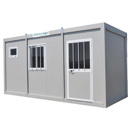 CODICE ARTICOLO: ITALFROM_9709 IL COSTO DEL TRASPORTO PER SARDEGNA ED ISOLE MINORI RICHIEDE UN PREVENTIVO A PARTE.DIMENSIONE ESTERNA:  CM 1114 x240 x 268  H DIMENSIONE INTERNA: CM 1100 x220 x 240 H   N.B. IL PRODOTTO VIENE FORNITO GIA' ASSEMBLATO. LA MOVIMENTAZIONE E LO SCARICO MERCI SONO ESCLUSI, SI PREGA DI FAR TROVARE PERSONALE CON MULETTO O GRU PER PROCEDERE ALLO SCARICO.Struttura: I profili sono realizzati in acciaio preverniciato RAL 9002 (spessore 1,5mm), da coils zincati (standard: UNI 5753-75);Base: Standard: Il profilo della base è realizzato da acciaio zincato e preverniciato RAL 9002 (spessore 1,5mm); Lamiera da solaio zincata non collaborante (spessore 0,6mm). Sul solaio viene posta un pannello in truciolare 18mm su cui viene incollato, utilizzando apposite resine, un pavimento in PVC antiscivolo R10 spessore > 2mm. Pareti esterne ed interne Standard: Realizzata in pannelli coibentati sp. 40 mm, composti con supporti in acciaio zincato preverniciato di colore bianco/grigio (spessore 0,4mm) secondo norme UNI EN 10169, con interposta coibentazione a base di schiuma poliuretanica densità D=38-40 Kg/mc Trasmittanza U=0,55 W/mqK. Tetto Standard: 1°livello) Realizzato in pannelli coibentati sp. 30 mm, composti con supporti in acciaio zincato preverniciato di colore bianco/grigio (spessore 0,4mm) secondo norme UNI EN 10169, con interposta coibentazione a base di schiuma poliuretanica densità D=38-40 Kg/mc Trasmittanza U=0,62 W/mqK. 2° livello) Lamiera grecata zincata da coperturaSerramenti, interni ed esterni Standard: Profili in alluminio (Bianco RAL 9010) completi di tutti gli accessori per l’uso e vetro (4mm), barre anti-intrusione, maniglie e serrature. - Porta standard: mm 1050x2100 (890x2060); - Finestra scorrevole a due ante mm 1050x1100 - Finestra vasistas mm 650x500 (inclusa nell’opzione servizi igienici) Impianto elettrico Standard: Una regletta led 1x13 ed una presa bipasso 10-16A.Impianto Idrico Tubi e raccordi in PVC a vista. Gli scarichi sono tutti separati a pavimento o a parete. L’utente dovrà raccordarli e convogliarli nel pozzetto finale.Ogni materiale utilizzato per la costruzione dei monoblocchi è certificato e garantito. I monoblocchi prefabbricati modulari sono fatti utilizzando uno speciale profilo leggero e resistente che rendono facile l’assemblaggio e l’accoppiamento.