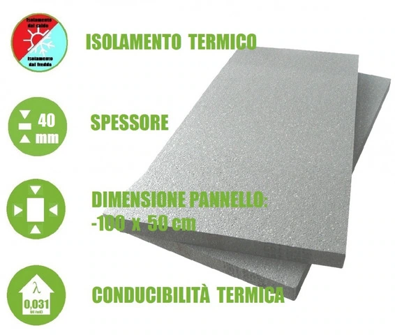 CODICE ARTICOLO: ITALFROM_15282 PANNELLI IN EPS 100 CON GRAFITE 'POLISTIRENE ESPANSO SINTETIZZATO' PER ISOLAMENTO TERMICO - 100x50x4 cm DESCRIZIONE PRODOTTOLa lastra per isolamento termico in Polistirene Espanso Sinterizzato è prodotta con materie prime di elevata qualità, e ricavata per taglio a filo caldo da blocchi preventivamente stagionati. L'EPS ha un peso molto ridotto poiché è composto dalla maggior parte di aria, questo fa si che risulta facile da posarlo in opera.DIMENSIONI PANNELLO100x50x4 cm.PARAMETRI AMBIENTALIL'EPS anche se è un materiale sintetizzato, è al 100% riciclabile e atossico. Le lastre sono utilizzate per l'isolamento termico degli edifici in quanto risulta determinante per il risparmio energetico, questo implica un minor costo per la climatizzazione invernale ed estiva. Il sistema cappotto è un rivestimento termico degli edifici in grado di garantire, in modo sicuro, l'isolamento dal caldo e dal freddo, con miglioramento sostanziale del comfort abitativo e riduzione dell'impatto ambientale.DETRAZIONI FISCALI PER IL RISPARMIO ENERGETICOL'utilizzo di materiali coibenti, come l'EPS, permette di usufruire delle agevolazioni fiscali previste per gli interventi di riqualificazione energetica sugli edifici esistenti. L'agevolazione consiste nell'usufruire di detrazione fiscali dall'Irpef o dall'Ires. La legge di bilancio 2018 ha confermato l'aliquota di detrazione al 65% per gli interventi di coibentazione dell'involucro opaco. CARATTERISTICHEStrato isolante costituito da pannelli di Polistirene Espanso Sinterizzato - EPS 100 kPa, da inserire in intercapedini, piani di soffitta, sottotetti, contro-soffitti, cappotti interni ed esterni. CARATTERISTICHE TECNICHEDalla tabella è possibile notare il valore molto basso della conducibilità termica 'lambda', ciò fa si che l'EPS è un ottimo materiale isolate!!!